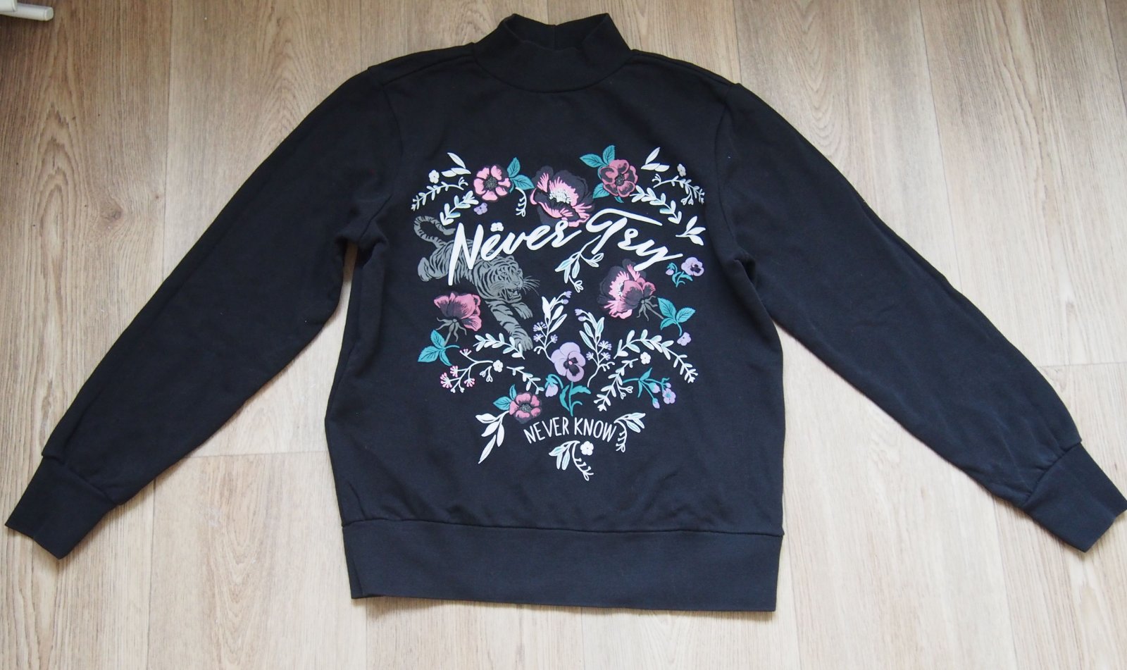 Tuto mikinu jsem měla moc ráda, má lodičkový výstřih a v pase je mírně projmutá, vhodná na postavu menší M, na cedulce tedy uvedeno L, ale to dle mého neodpovídá. Hnědá už začíná být trochu opraná...