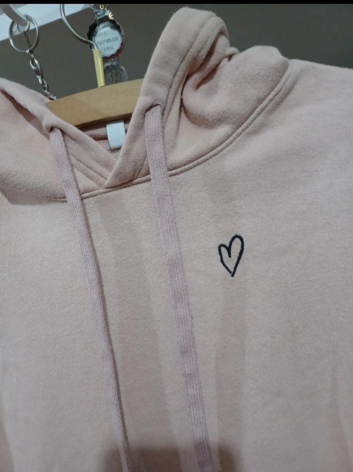 Krásná croptop mikina se srdíčkem, barva něco mezi meruňkovou a starorůžovou. Běžné známky praní, žmolky, oblíbená. Vel.XS, dcera měla při 158/164