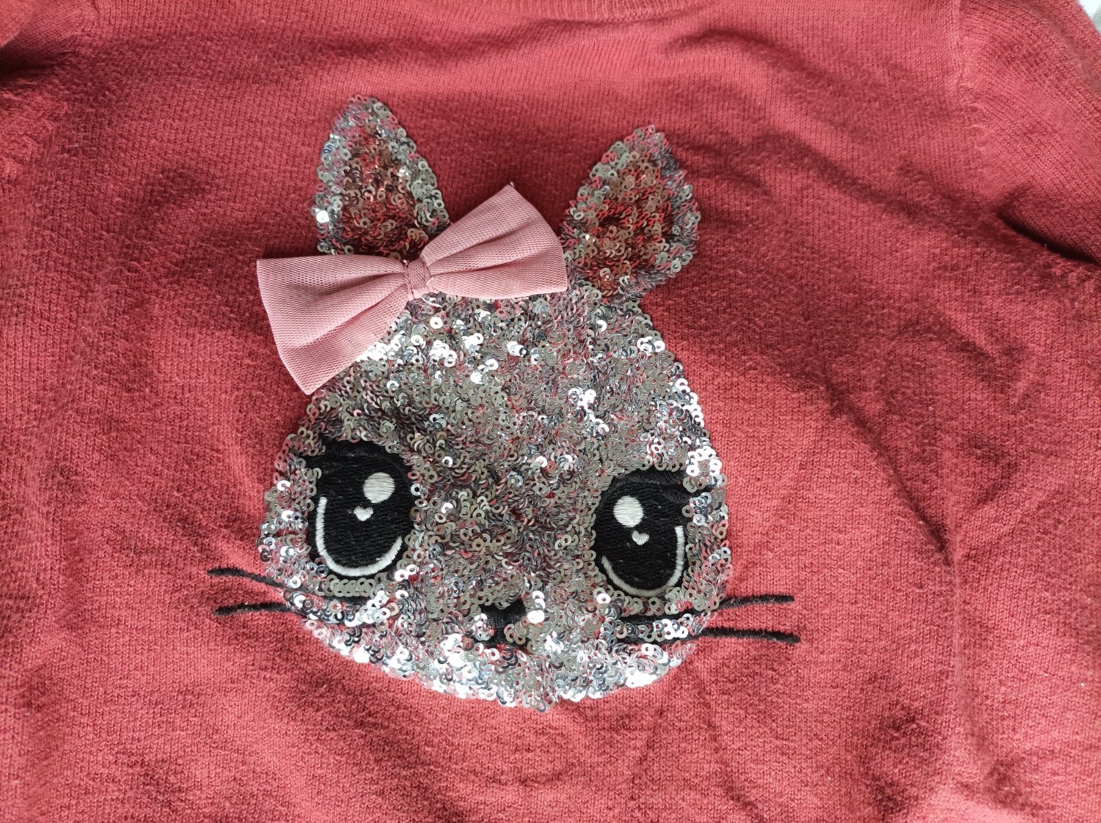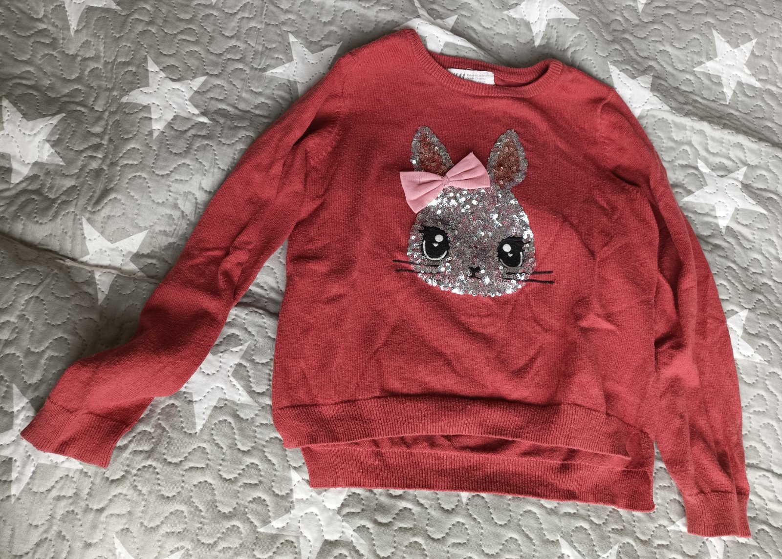 Slabý svetřík s flitrovým králíčkem. Vel. 110/116, zadní díl mírně prodloužený.