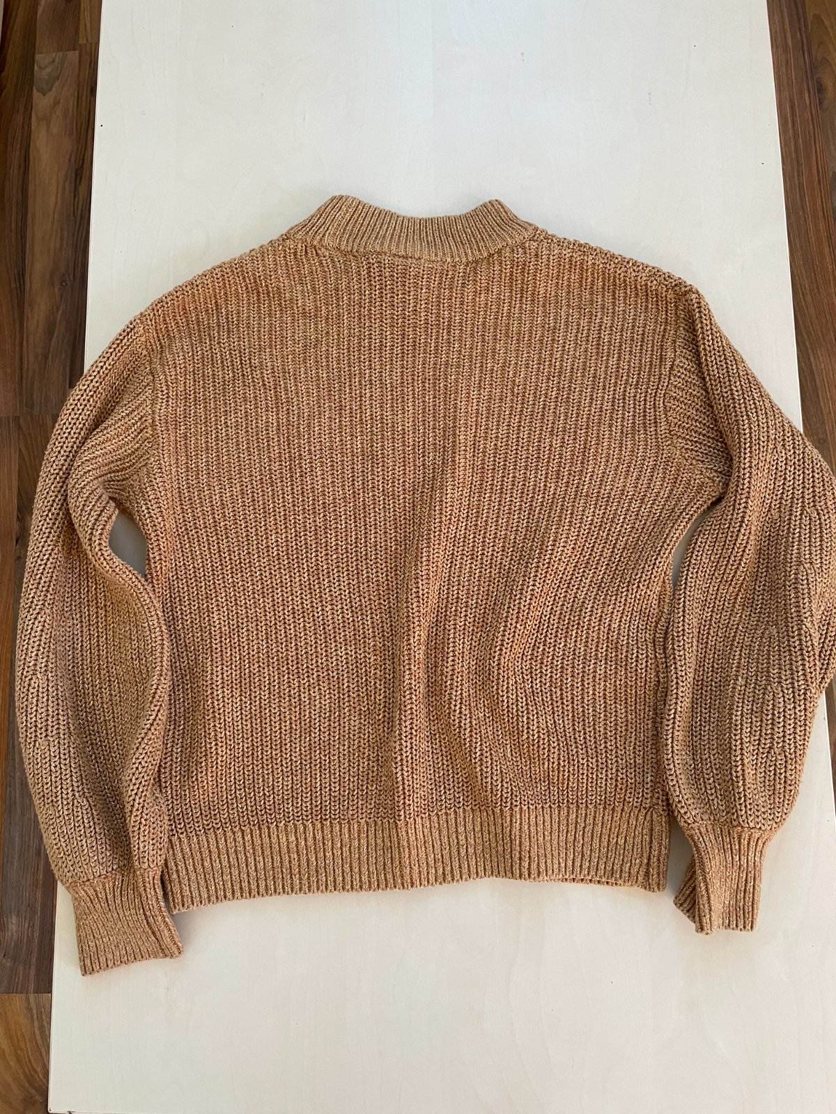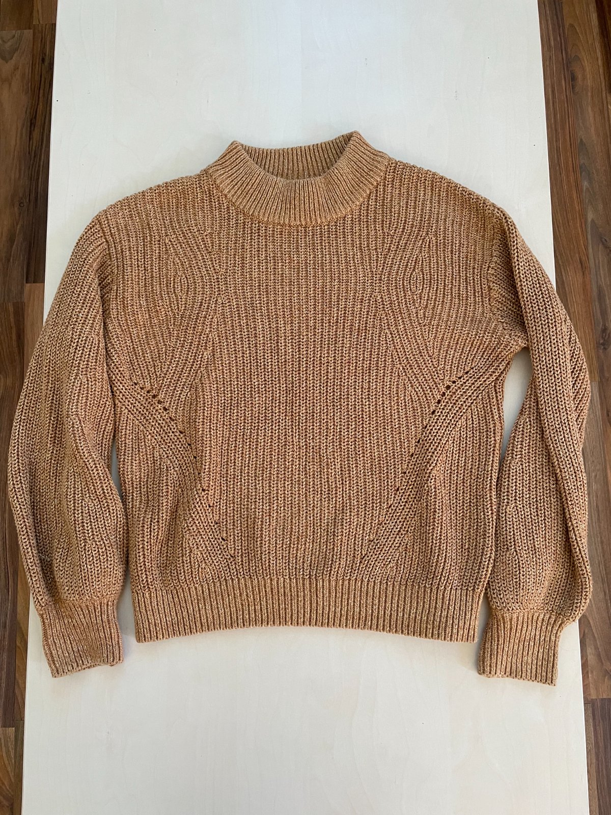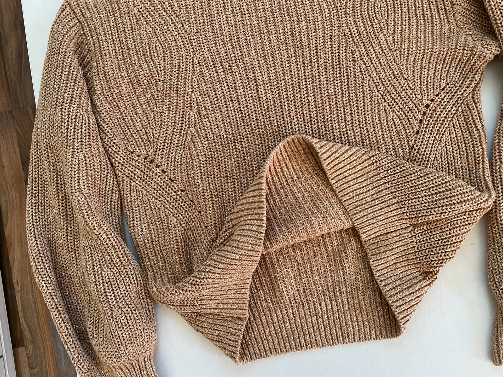 let. nabízím k prodjie ttyeno běžový do světel hnědý svetr protkaný třpytivou zlatu nití, vel S, HM. teplý medový odstín, na fotu neviniká. úplet se vzorem. materiál 51% acryl, 44% bavlna, 3% elasten, 2% metalic vlákna. Nošený, bez vad, krásný