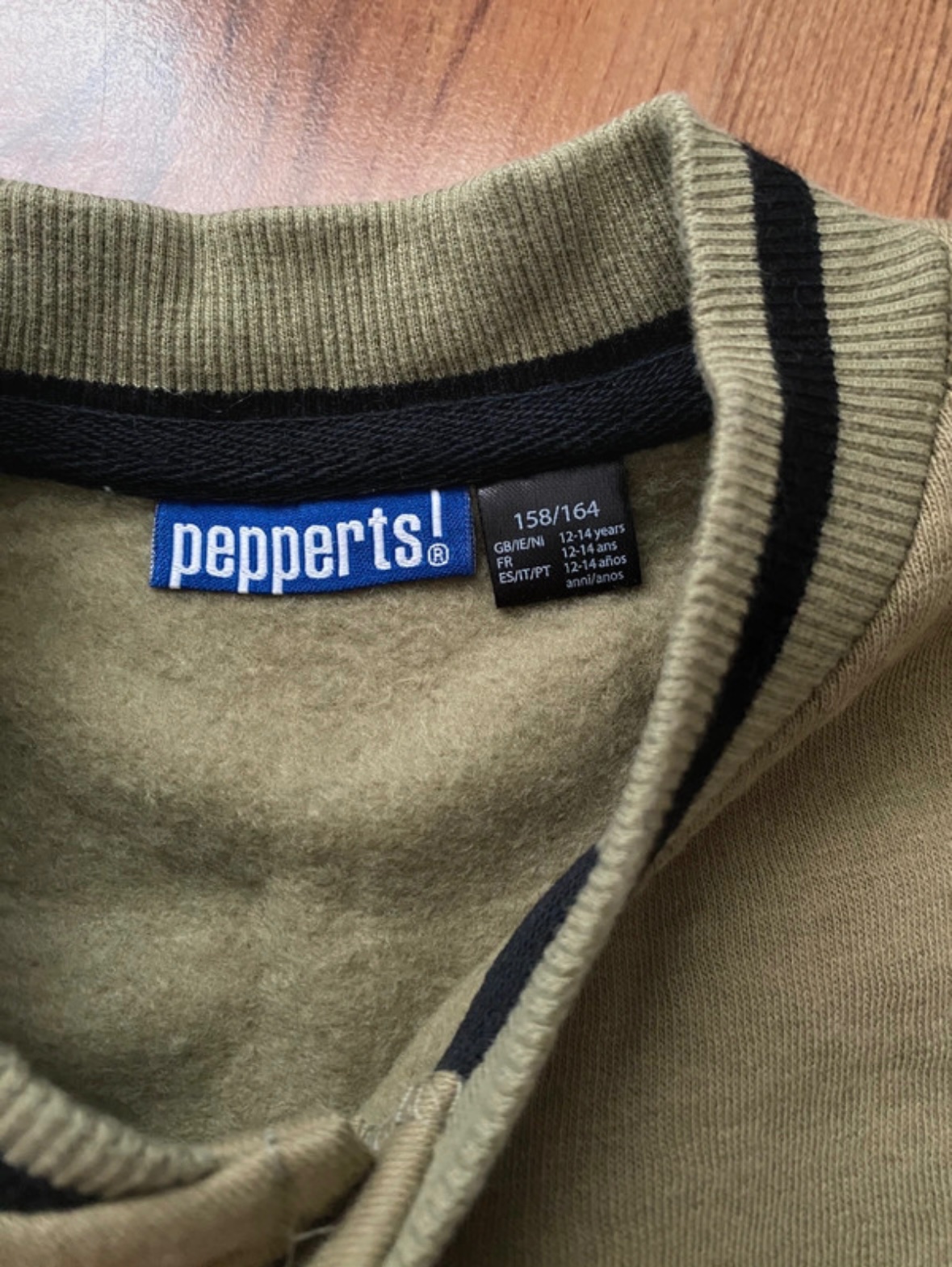 Chlapecká zelená mikina Pepperts, vel. 158/164. Mikina není moc teplá. Barva odpovídá det.fotce. Mikina je téměř nenošená, nestihli jsme unosit, bez vad. Rozměry: pas 2x47 cm, délka 64cm, délka ruk...
