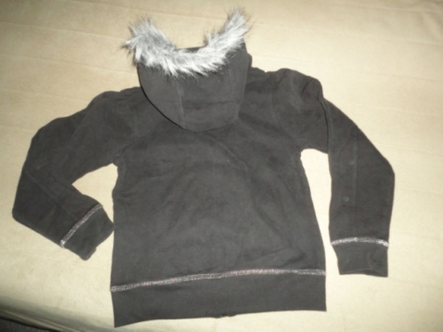 Krátce nošená, dovezená z Francie, bavlněná, teplejší mikina s vypodloženou kapucí, která je lemovaná umělou kožešinou, Barva temně hnědá, tmavá čokoláda, vpředu plastický, něco jako semišový šedo stříbrný potisk, nášivky s flitříky, kolem rantlů zdobné prošití stříbrnou nití, kapsy zdobené na rantlíku drukem ve tvaru stříbrné hvězdičky, i když není bundice snad ani nošená, našla jsem při focení vzadu v nápletu puštěné očko, asi už od výrobce, chycené, spíš pro pořádek uvádím. Uvedená vel. 140, ale tato značka je menší, měřte, d. 48, š. v průramku 39, dole v nápletu v klidu 36, rukáv od průramku 41,5, od kapuce 54cm