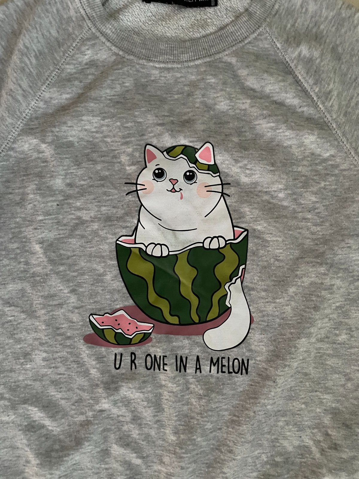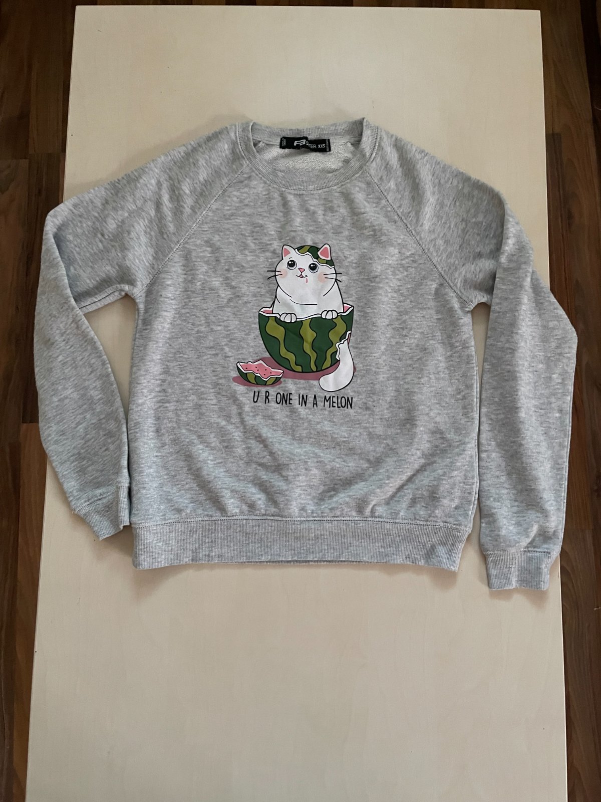 hol. nabízím k prodeji tuto šedý melír mikinu s obrázkem kočky v melounu, vel XXS, FB sister. Obrázek struktura jako nažehlovačka, nápis potisk. Materiál 70% polyester, 22% viscoza, 8% bavlna. nošen, bez vad, jen má chloupek/žmolíček, ale zaniká v melíru a to myslím tyto mikči mají už i nové nebo pár praních, nic rušivého, obrázek také ok, nenosila ji moc, krásná