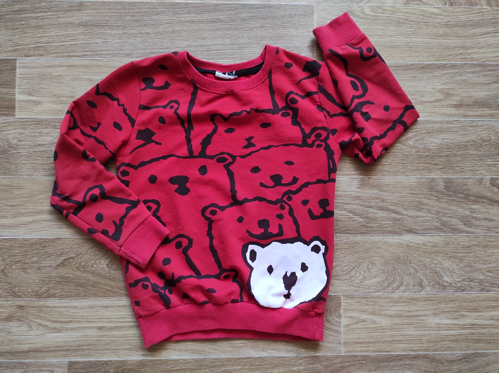 Červená mikina s potiskem mimoně.. velokost 122. Délka 42 cm, rukáv 36cm/30 cm. Stav: na ven nebo do školky- obrázek je popraskaný, na zádech dvě malé dírky