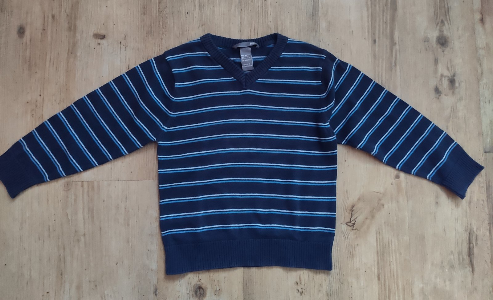 Svetr modrý, velikost 98/104, značka H&M. Pruhovaný svetr, velikost 104, značka Next. Cena za oba, popřípadě po domluvě cena za kus.