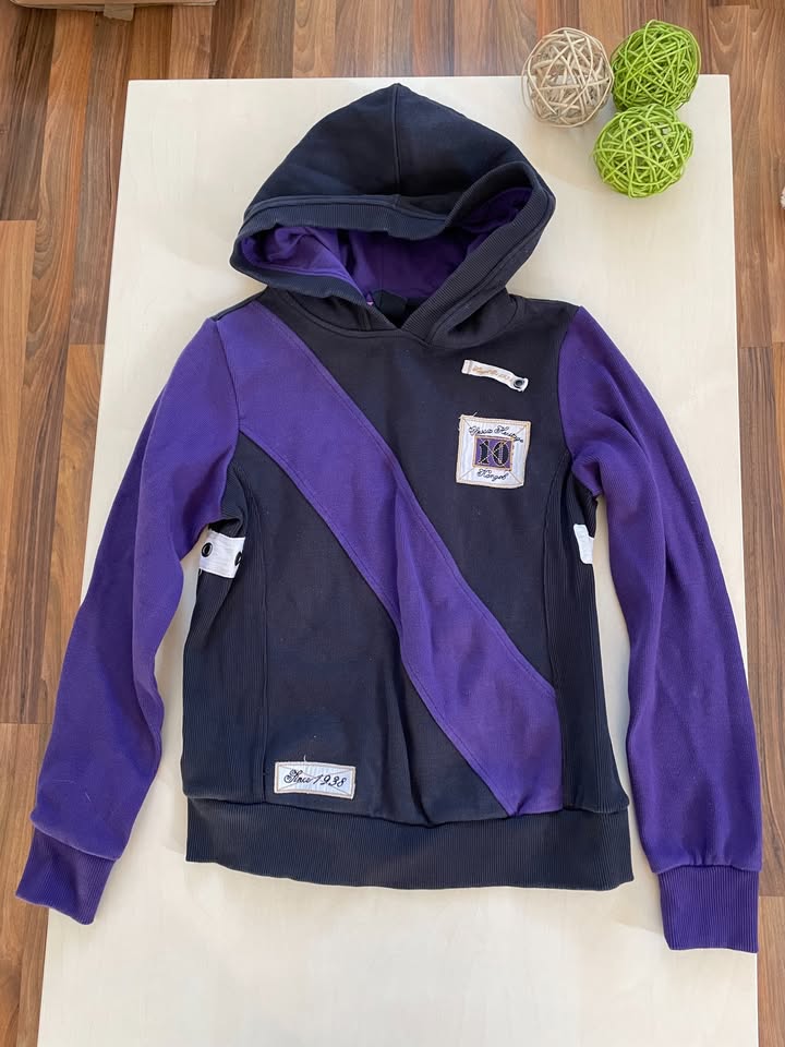 nabízím k prodeji tuto mikinu s nášivkou, vel 8/S, Kangol. Barva základ černá + fialové pruhy (foťák z nich dělá modré, ale nejsou!). Místy náševky. Materiál takový žebrovaný - 60% bavlna, 40% poylester. Nošená, bez vad jen prací chloupek, krsáná