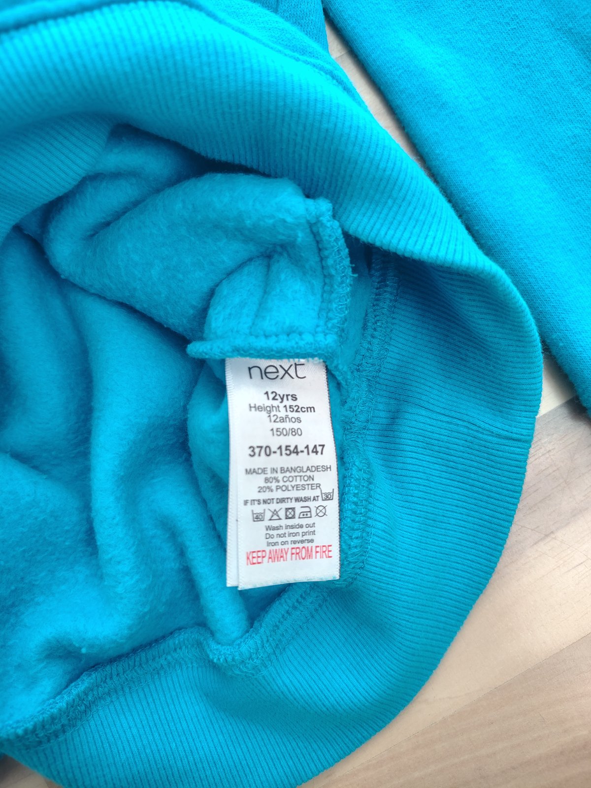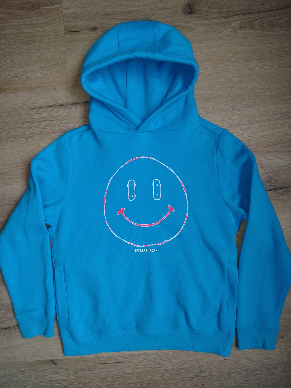 Dětská mikina s kapucí Next 152 (12 let), uvnitř chloupek/teplejší. Krásná jasná tyrkysově modrá barva, vpředu velký obrázek smajlíka, který má místo očí skateboardy. Námi kupovaná nová z Anglie, skvělý stav.
