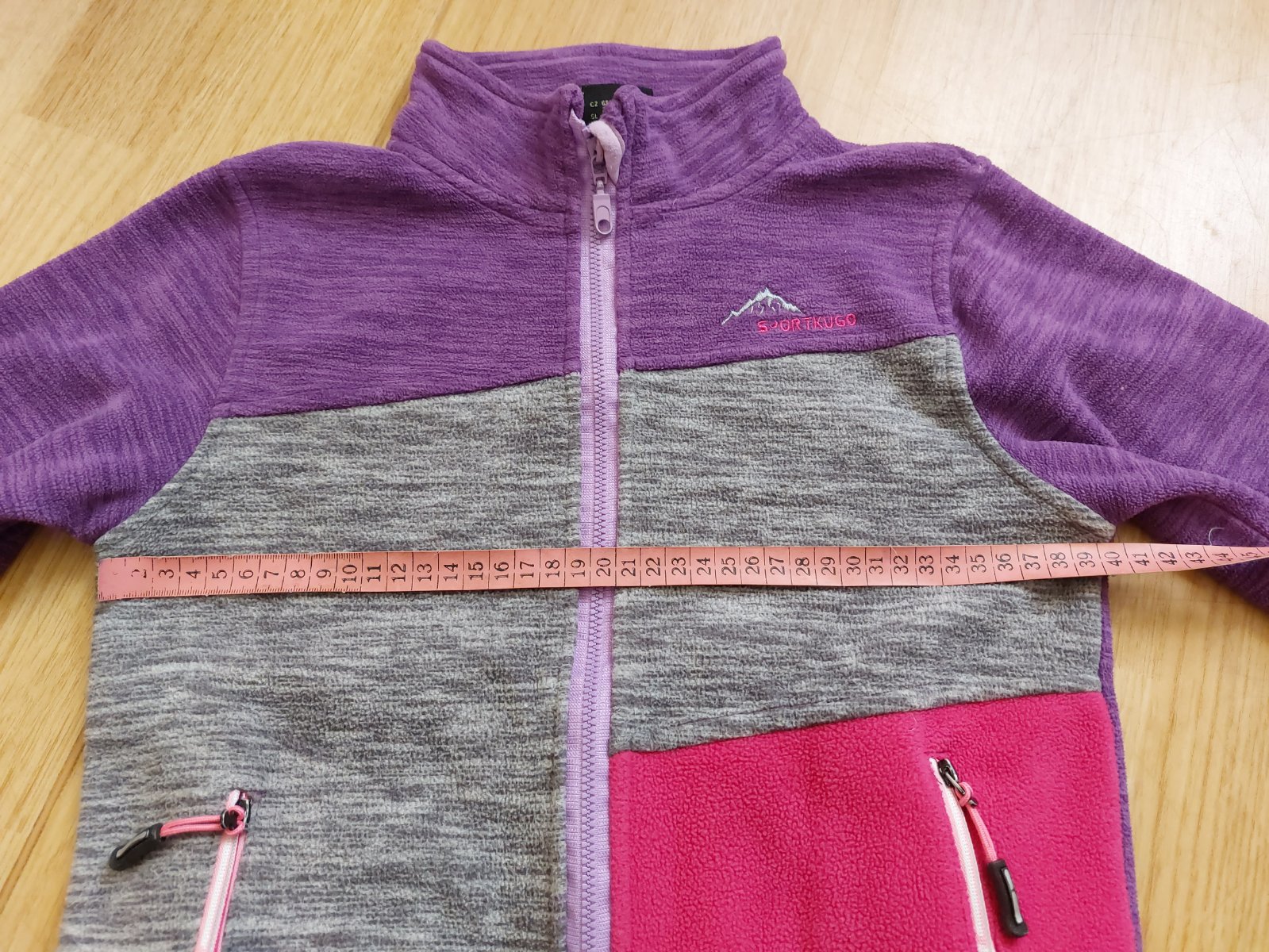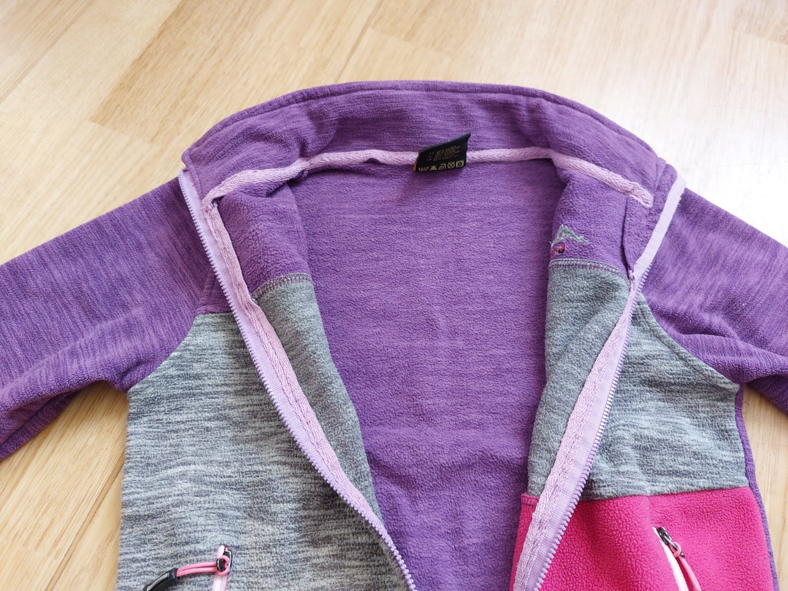 Fleecová mikina na zip. Nošení se nejvíce projevilo na lemu rukávů. Zip není originál, ten se rozbil, byl profesionálně nahrazen novým.