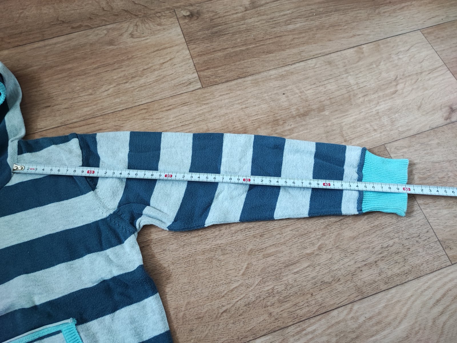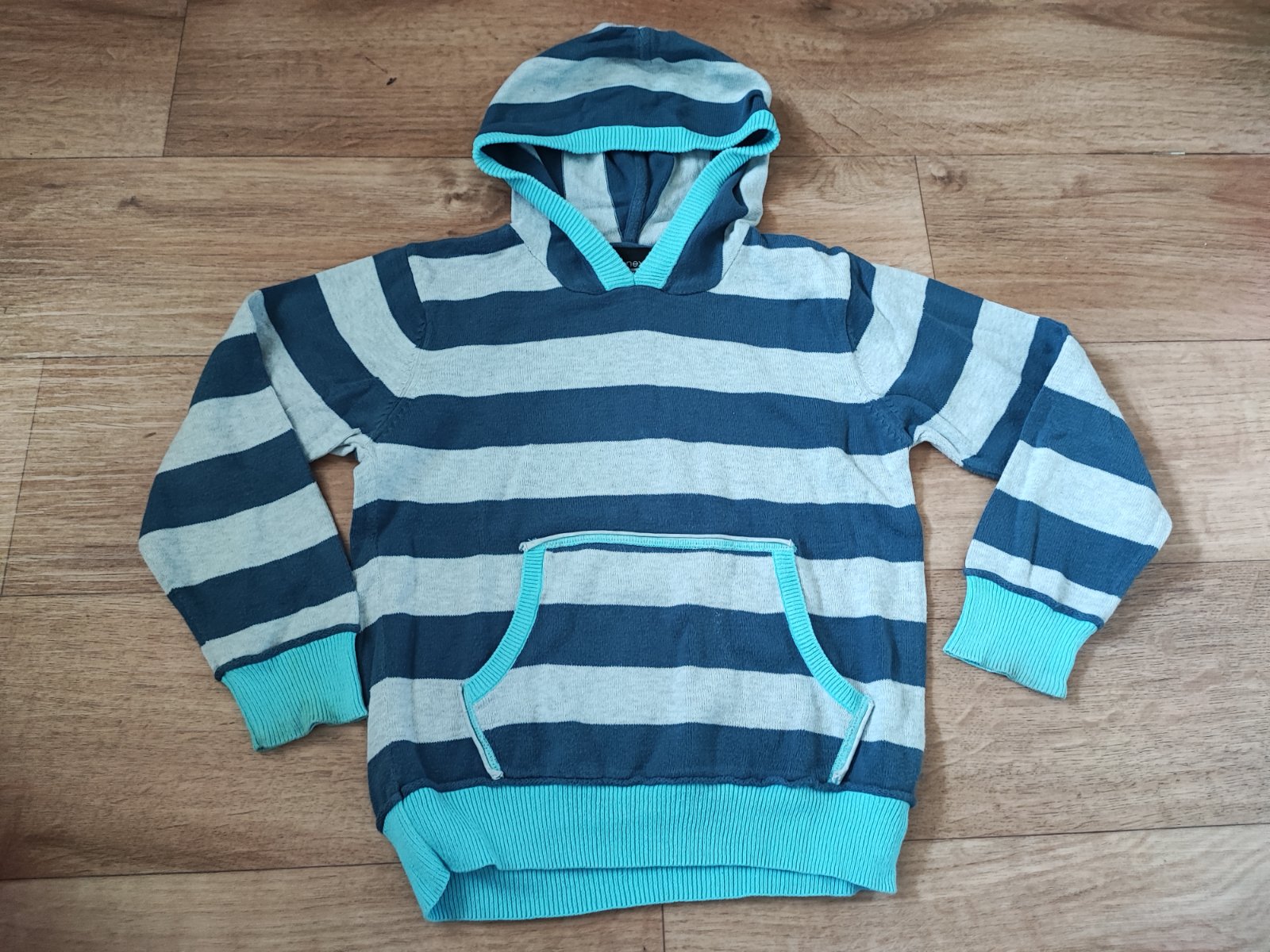 Tenký svetřík s kapucí a klokaní kapsou. Zn. Next, velikost 122 - rozměry na fotkách.
