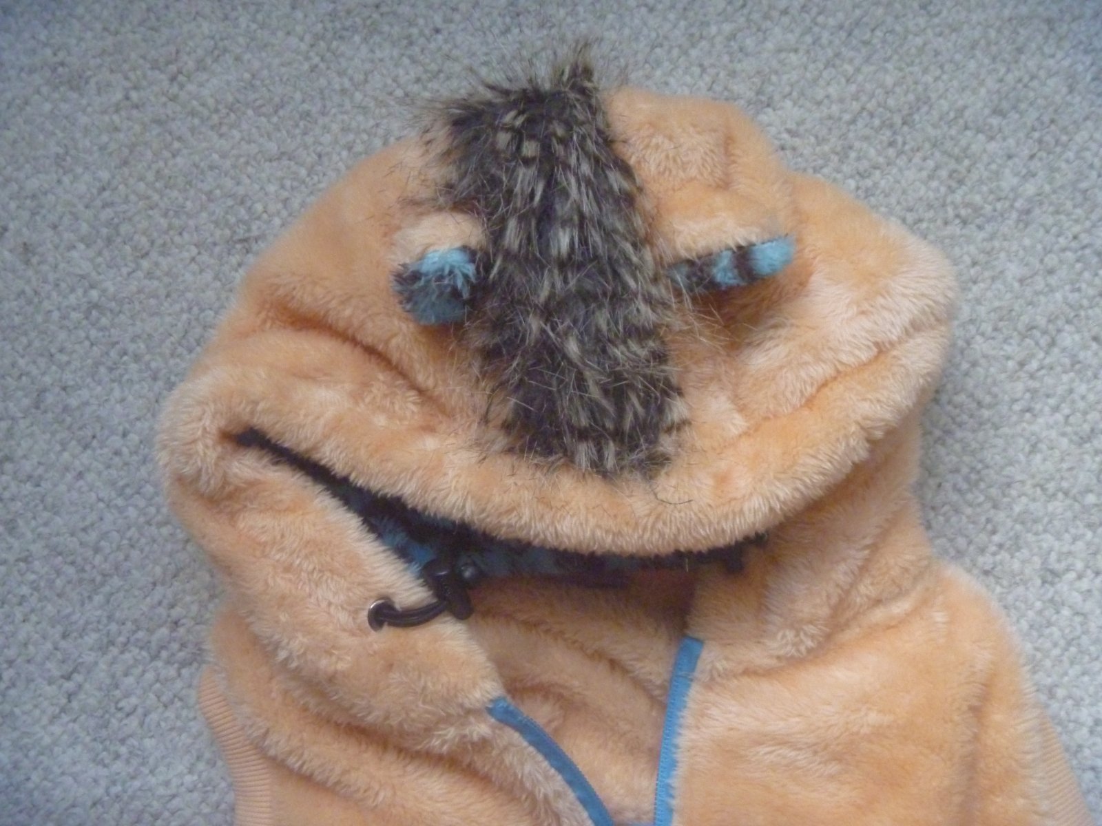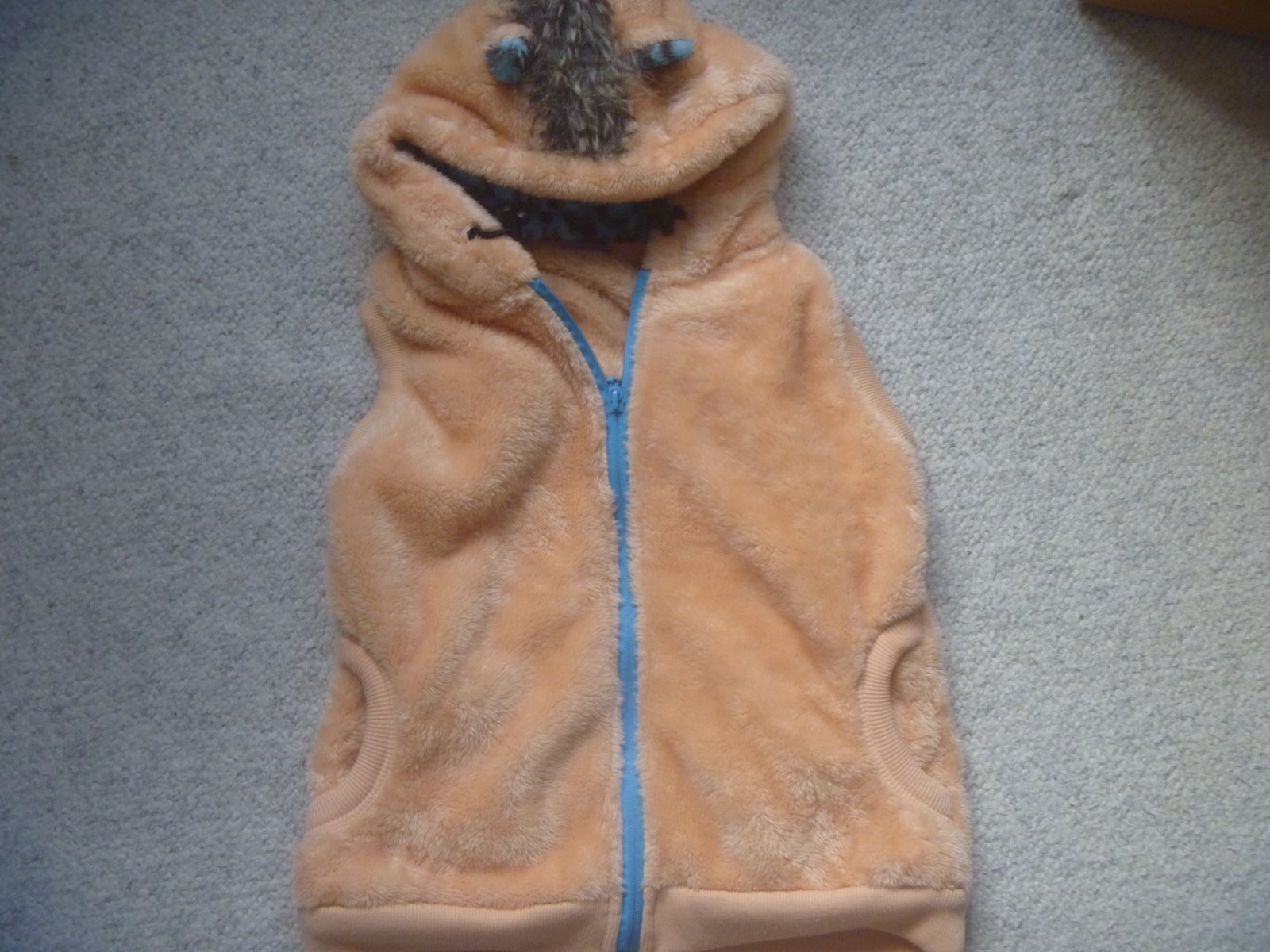 Prodám oranžovou chlupatkovou vestu s kapucí s oušky, lze stáhnout šňůrkou, na zip, s kapsami, velikost 134/140, dobrý stav.