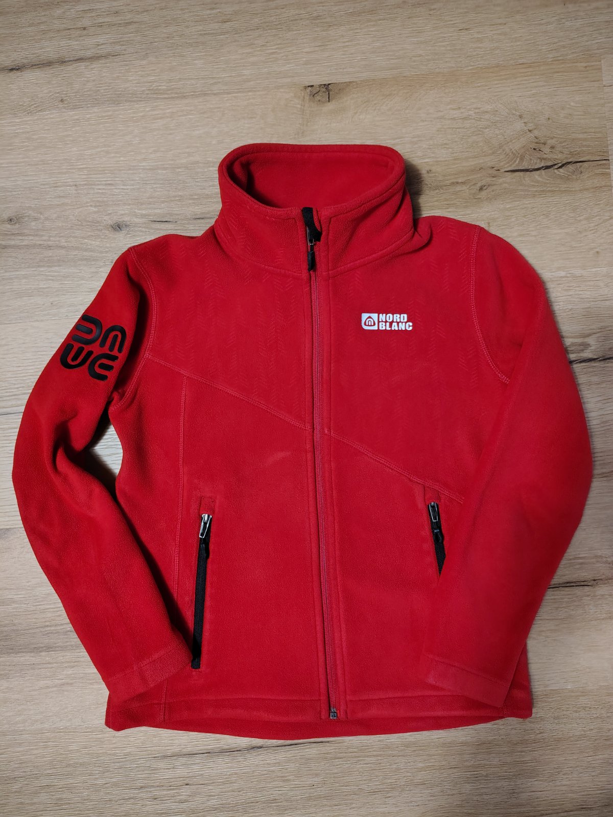 Mikina je ve skvělém stavu, námi kupovaná nová. Používaná primárně na lyže. Barva sytě červená a látka je po celé mikině texturovaná (viz foto detail).