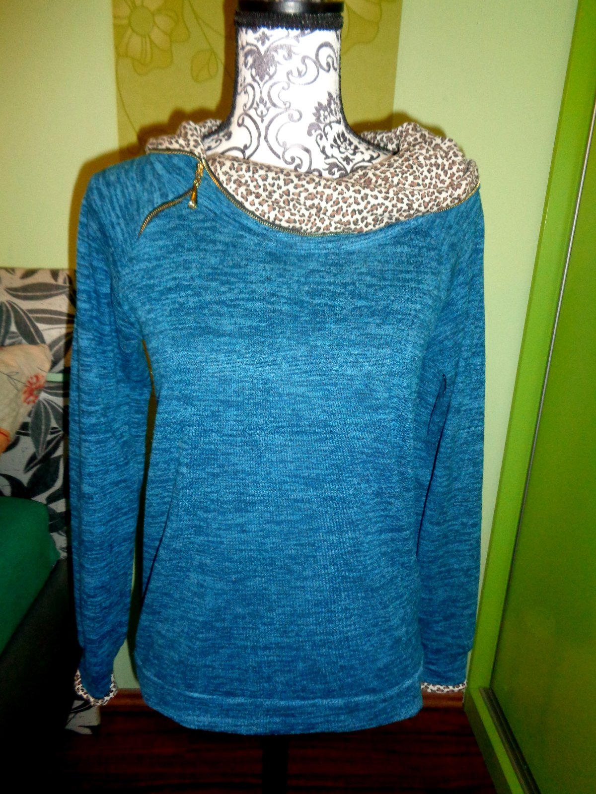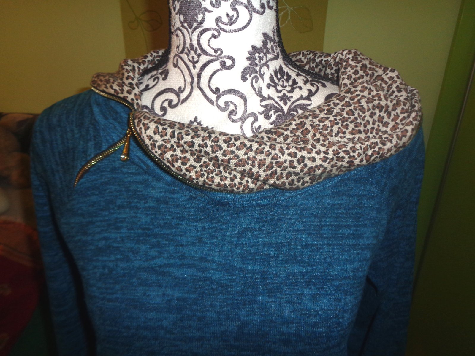 95% VISKOZA A 5% ELASTEN - VELMI PŘÍJEMNÝ - SLABŠÍ. KRÁSNÁ ŽÍHANÁ PETROLEJOVÁ BARVA. KRÁSNĚ ŘEŠENO KOLEM KRKU - ZVÍŘECÍ MOTIV - ŠIKMÝ ZIP - LZE DLE POTŘEBY OTEVÍRAT. TYGROVANÉ TAKO KONCE RUKÁVŮ. NOŠENÝ - BEZ VADY - VELMI MÍRNÉ ŽMOLÍKY.