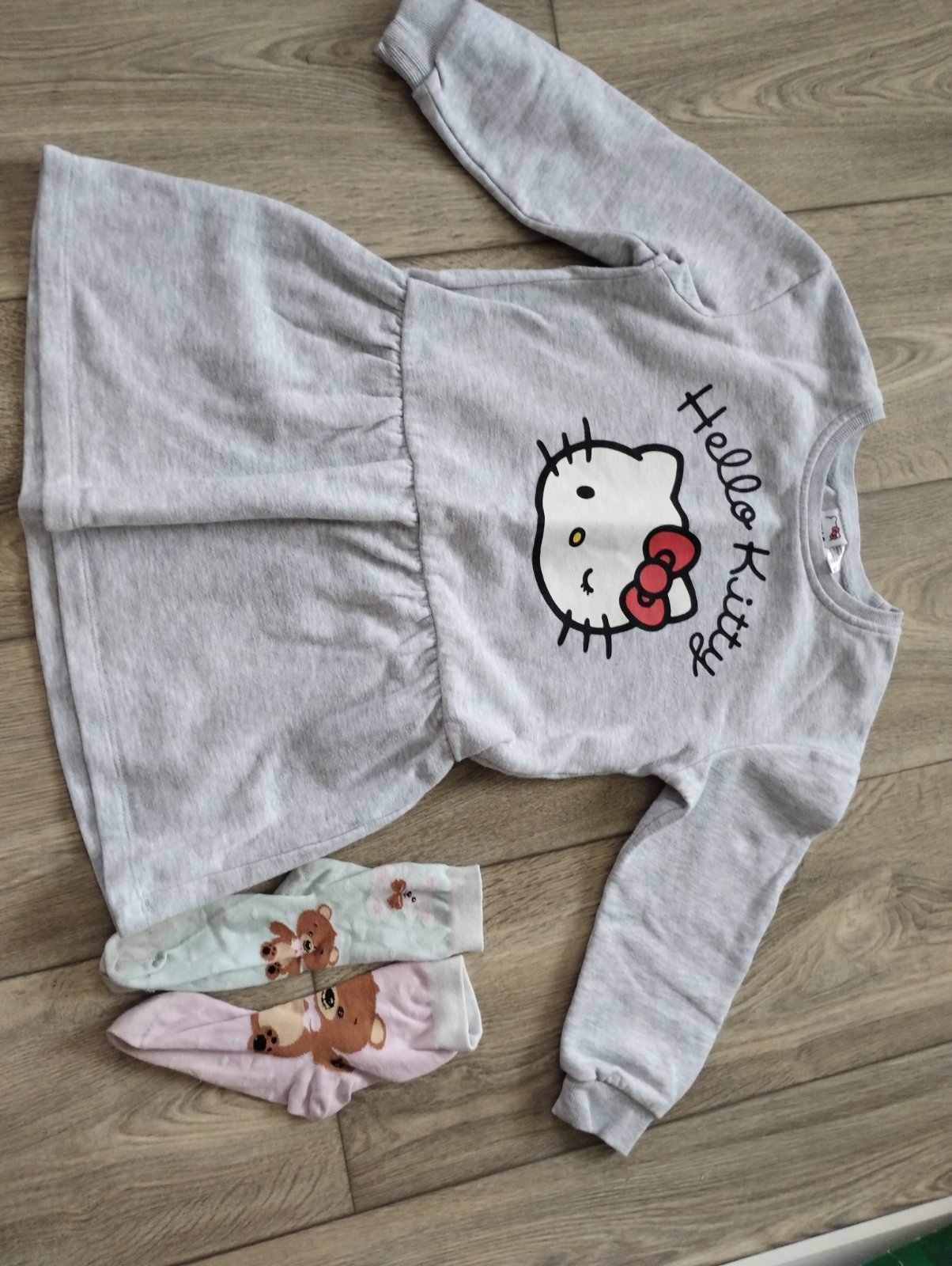 Nošené mikiny-3ks: - šedá na zips s Hello Kitty zn. M&S vel. 116 5-6let bavlna+polyester, bez fleků a děr, v nošeném stavu D 39, Š 34, rukav od krku 42cm. - tyrkysova s puntíky zn. NEXT vel. 116cm ...