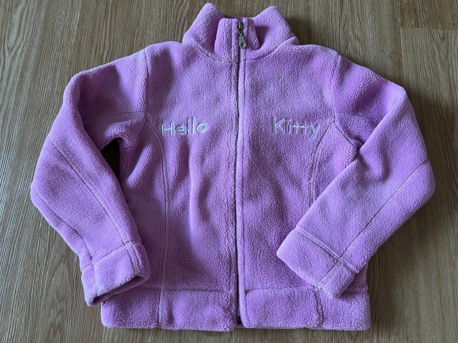 Prodám nošenou velmi teplou mikinu v dobrém stavu – dírky. Zapínání na zip, 2 kapsy (jedna děravá). U nápisu Kitty malá dírka z prošití, rozpáráno na vnitřní straně stojáčku (pokud bude zájem a chvíle, zašiji).