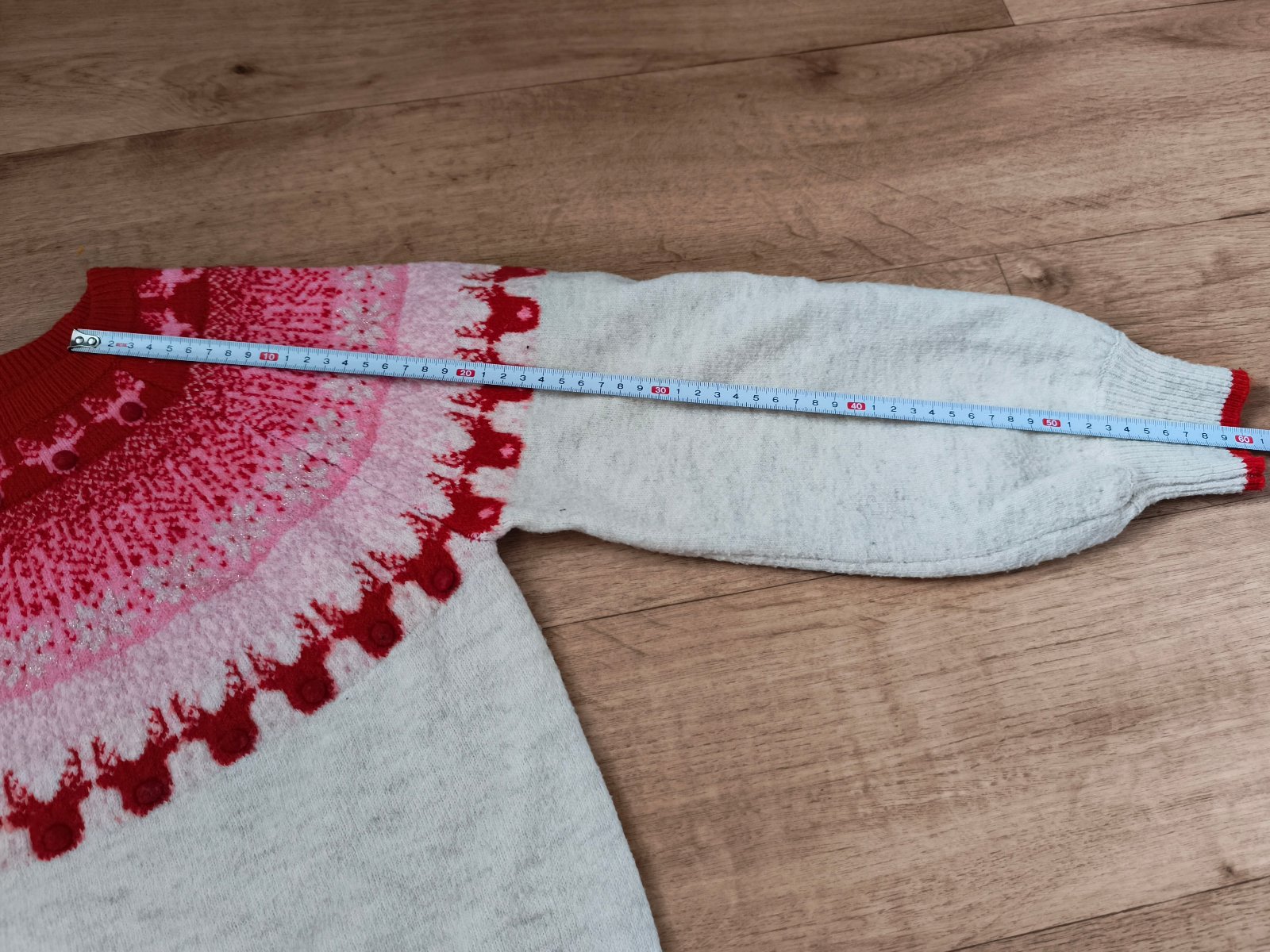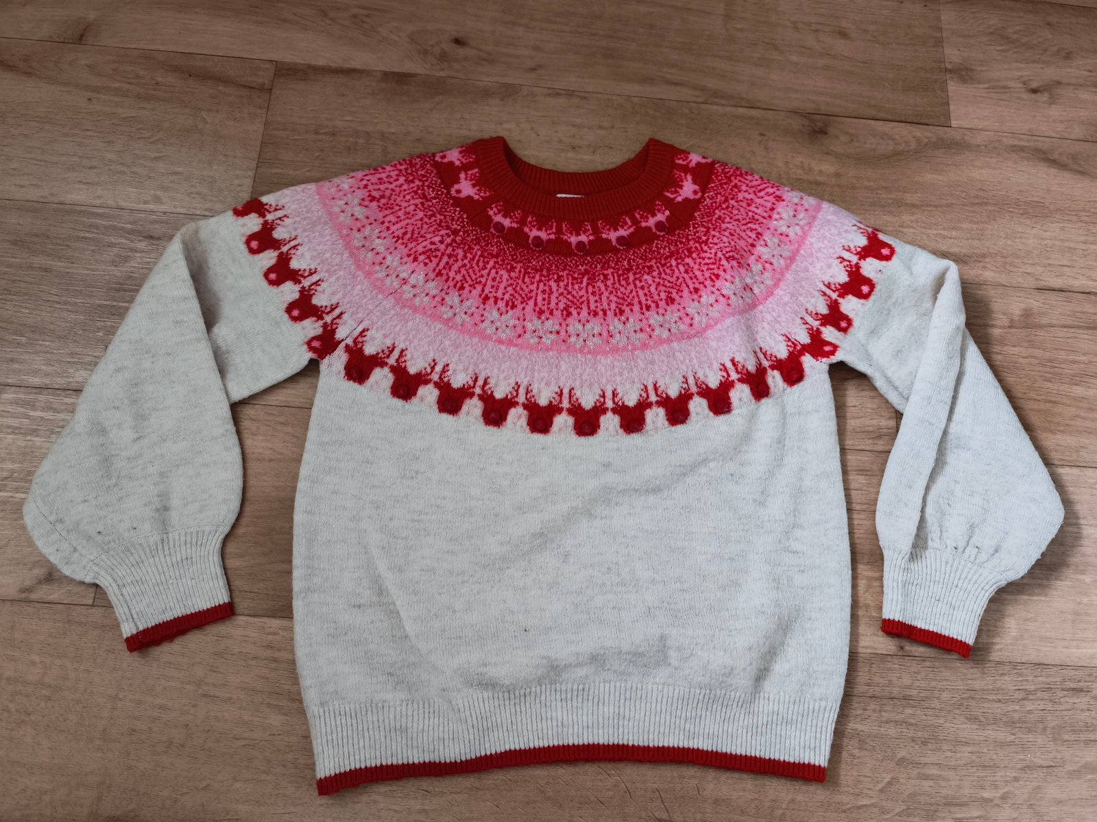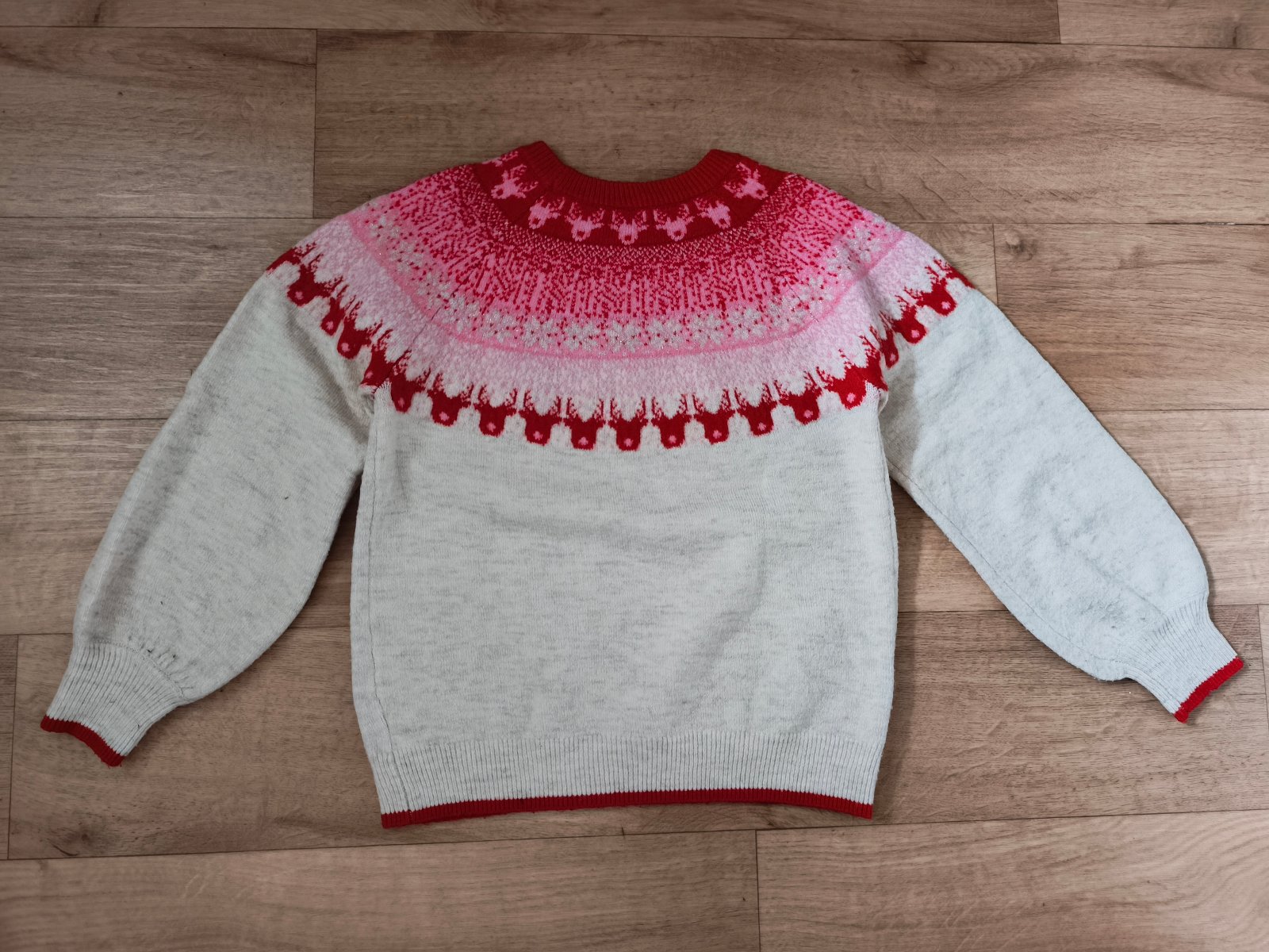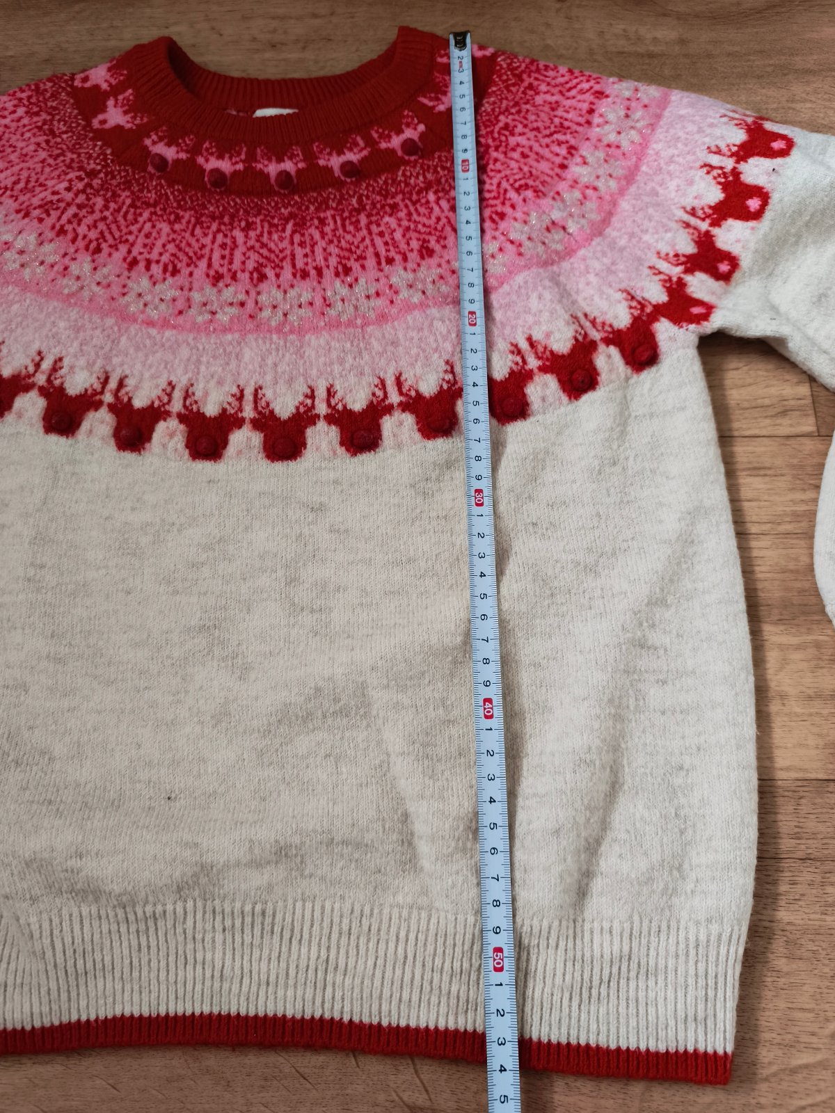 Krásný svetr, vzatý snad jen 1x. Barva krémová. Motiv sobů - použitelný i jako vánoční. Velikost 146 (10-11 let) - rozměry a podrobnosti na fotkách.