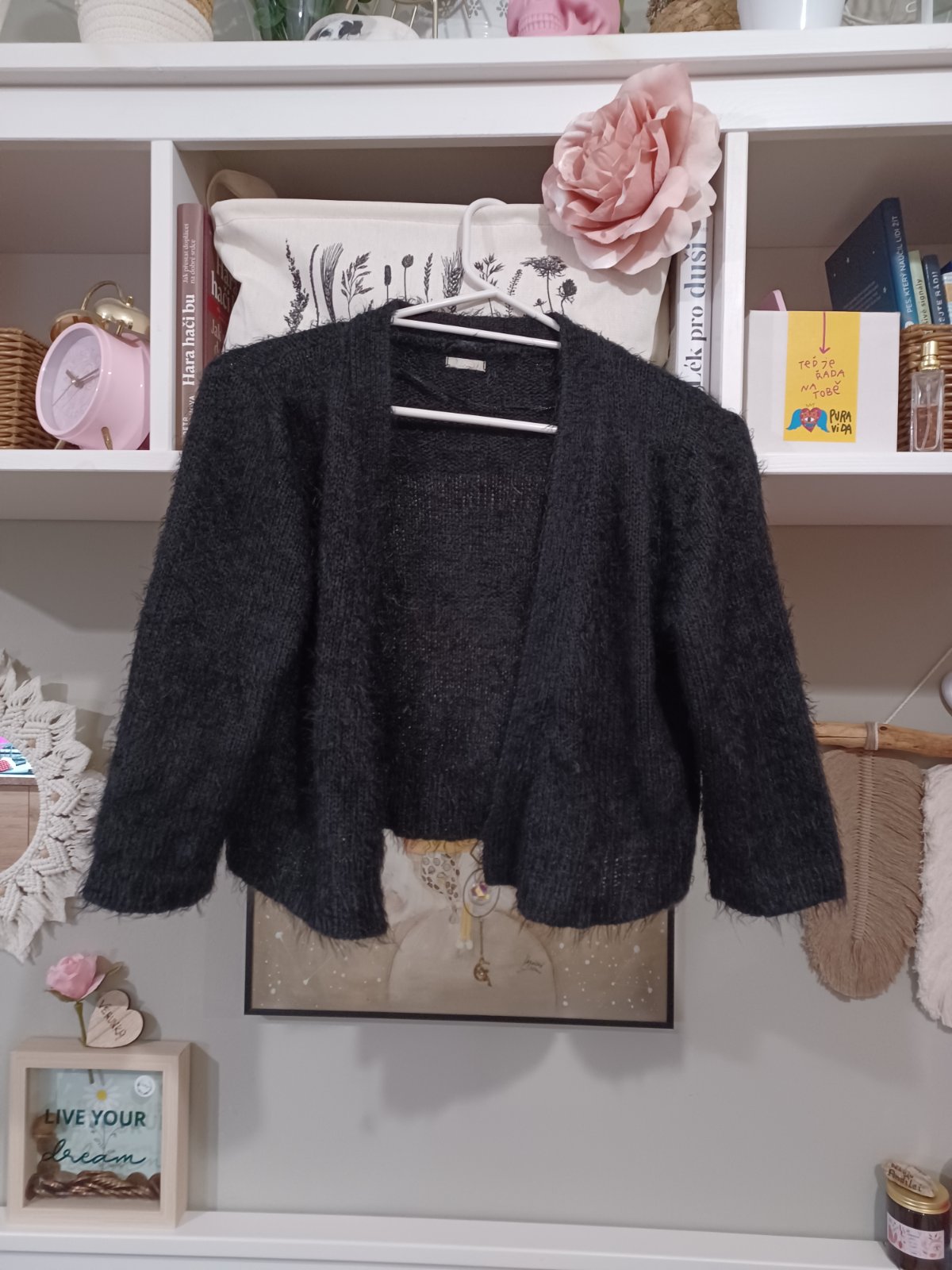 Krásný pružný krátký kardigan bez zapínání s 3/4 rukávem, sedne XS-S nebo 158-164. Zn. OVS. Vhodný i na kostým čerta.