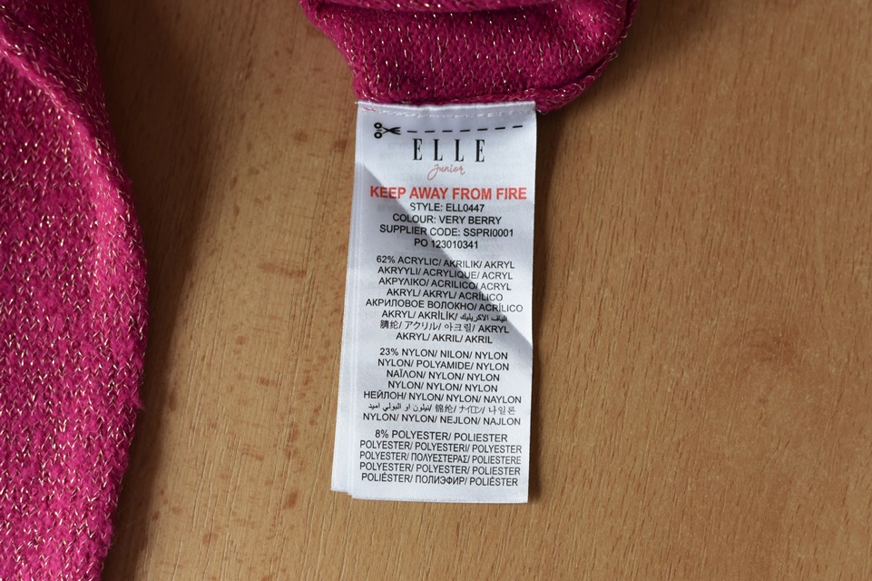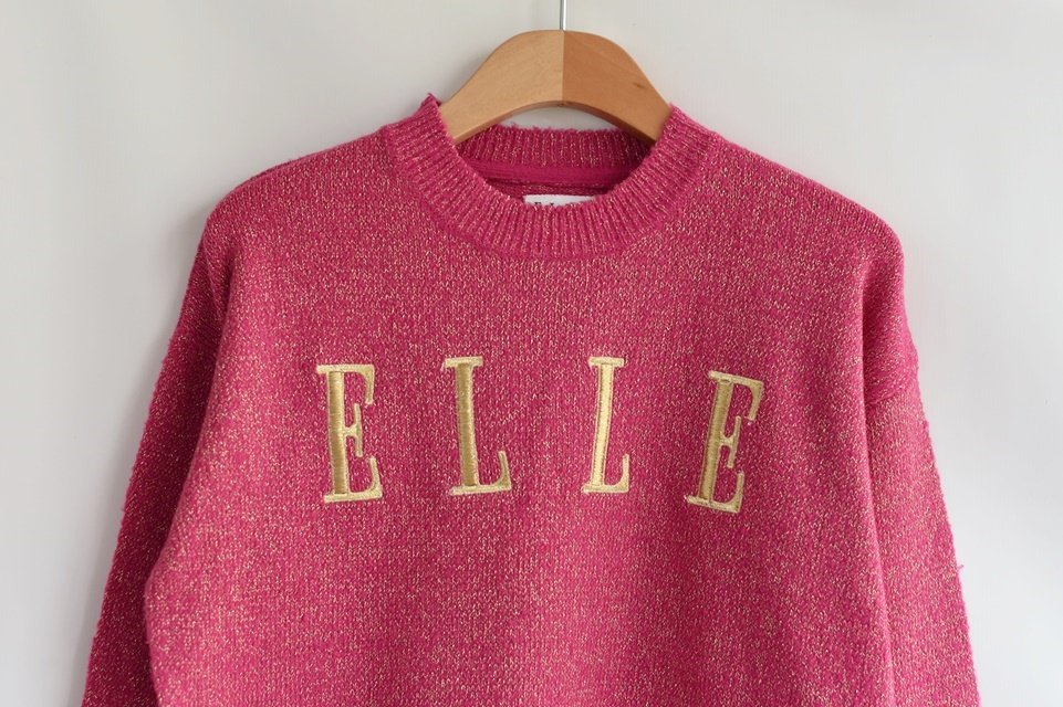 Tm. růžový svetr značky ELLE, protkaný zlatou nití.