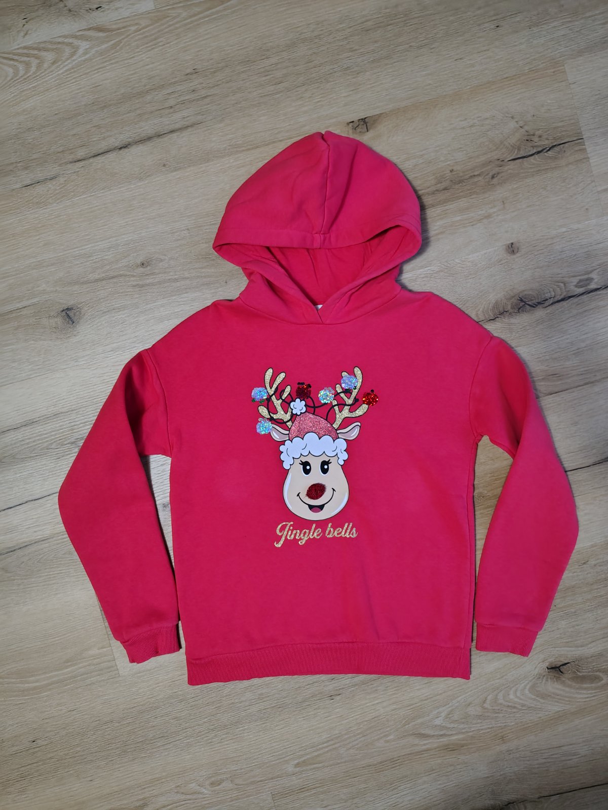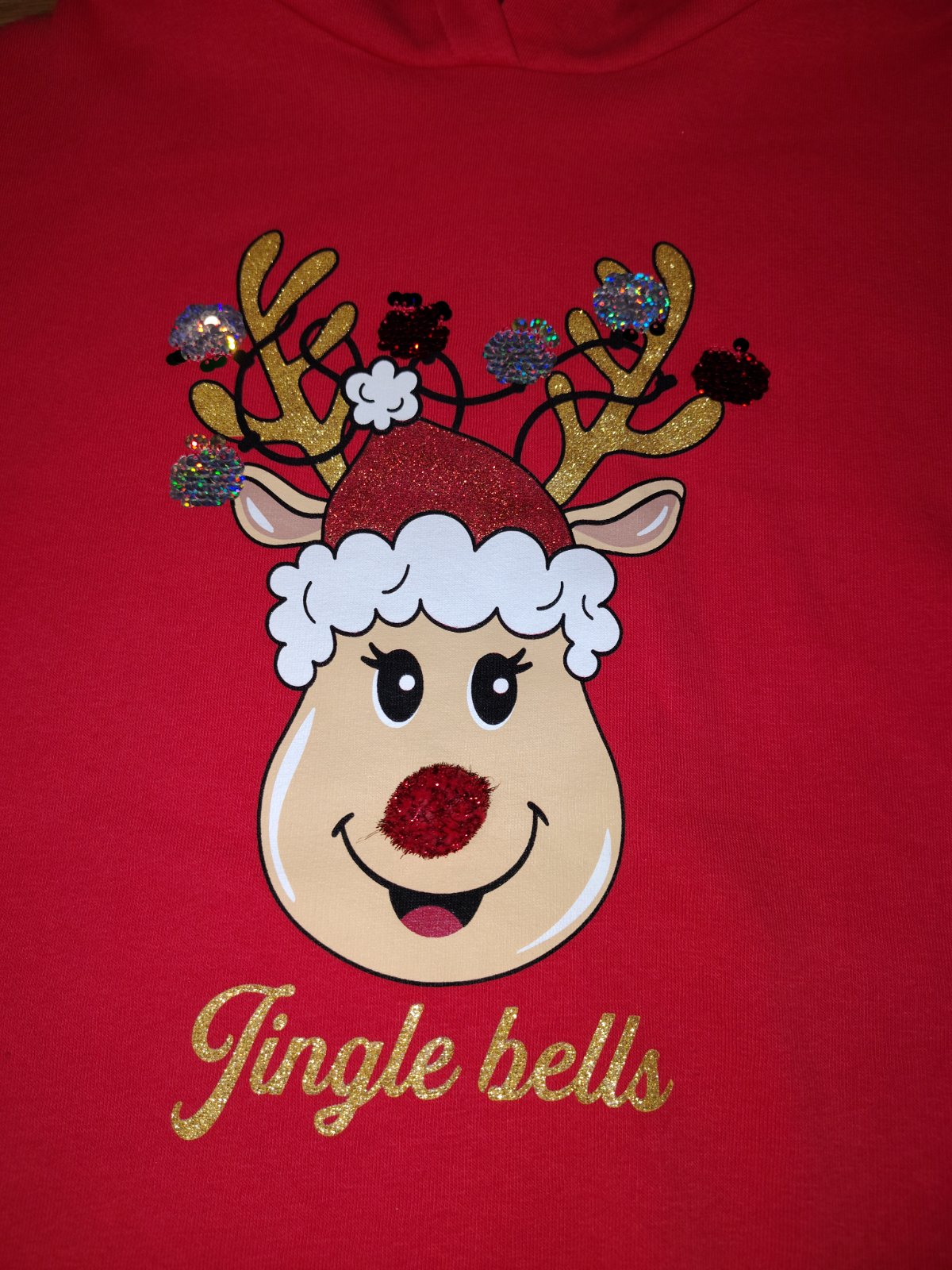 Dívčí mikina s kapucí a vánočním motivem soba s nápisem „Jingle bells“ C&A 158, sob je zdobený flitry a částečně třpytivou barvou
