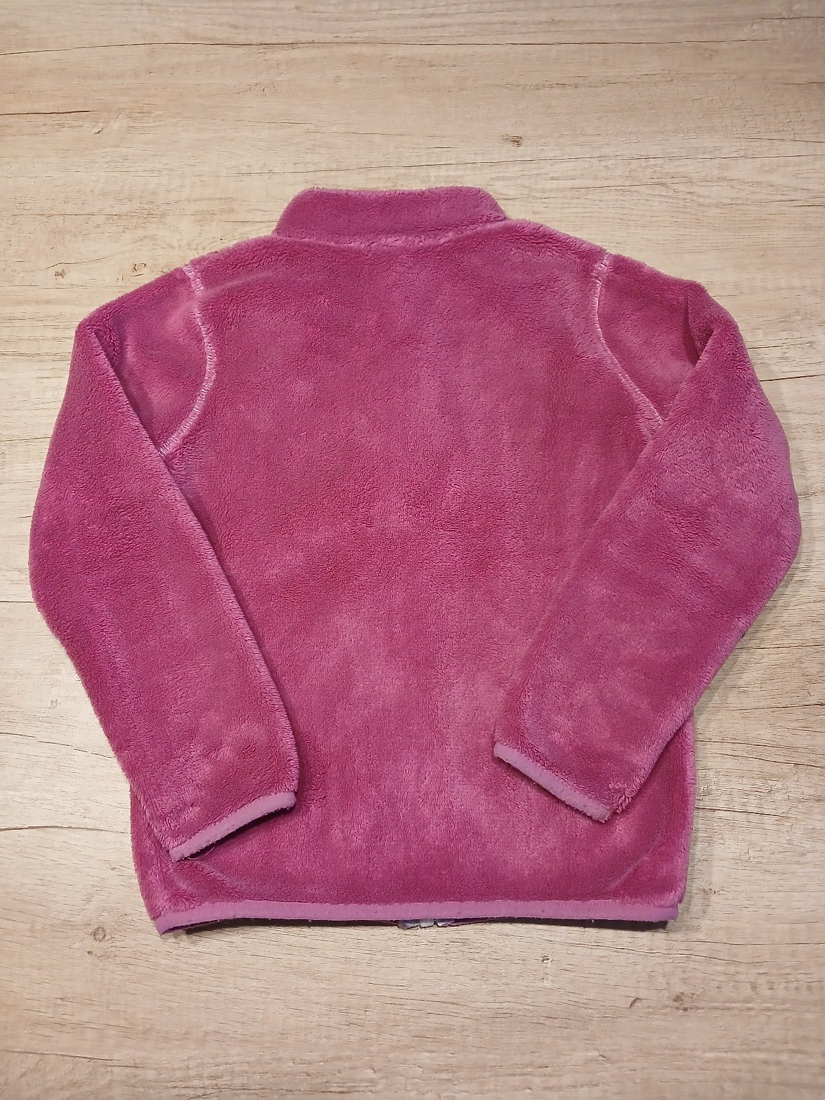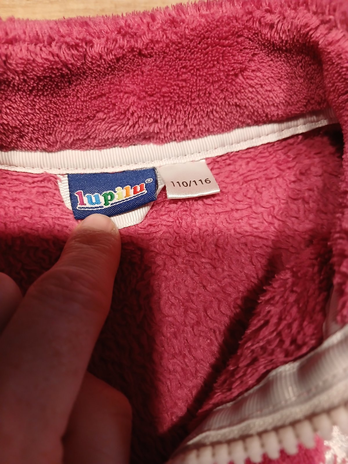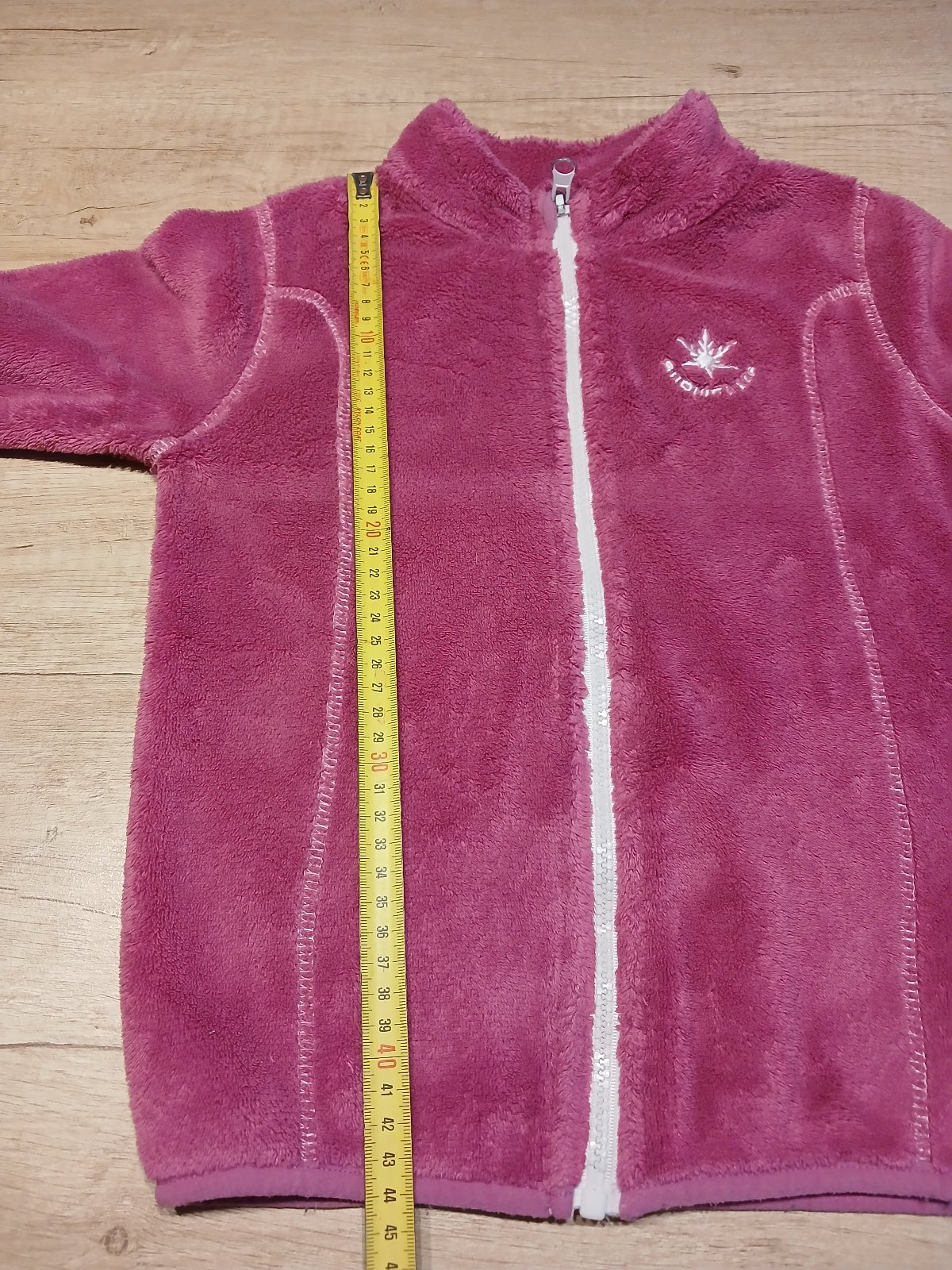 Syte ruzova flisova mikina se stojackem, velmi prakticka a hrejiva, vel.110/116.velmi pekny stav bez vad,jen par zmoliku na lemu a trochu odreny tahacek zipu, zohledneno v cene.