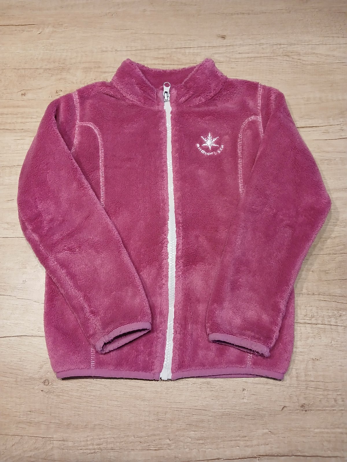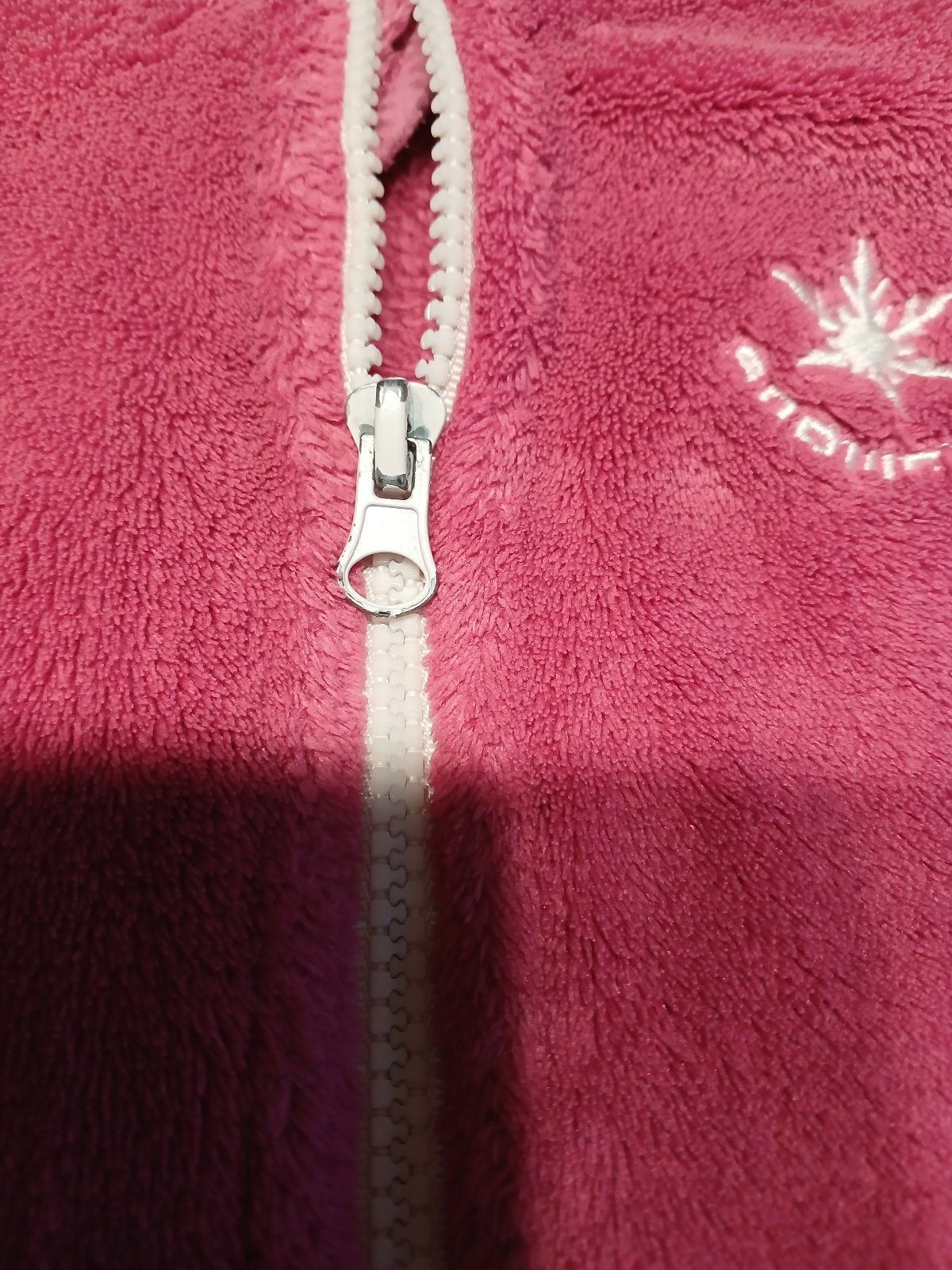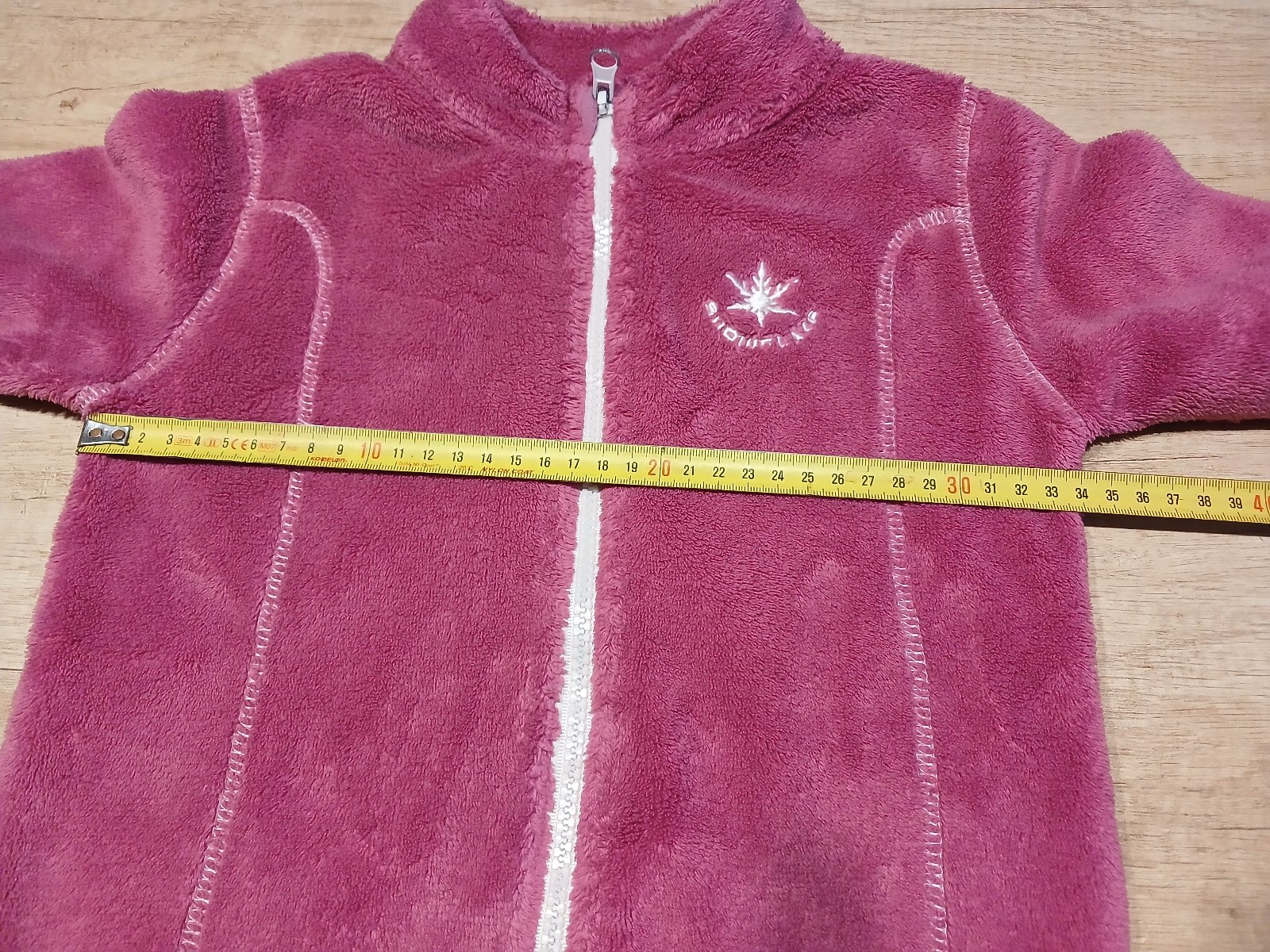 Syte ruzova flisova mikina se stojackem, velmi prakticka a hrejiva, vel.110/116.velmi pekny stav bez vad,jen par zmoliku na lemu a trochu odreny tahacek zipu, zohledneno v cene.