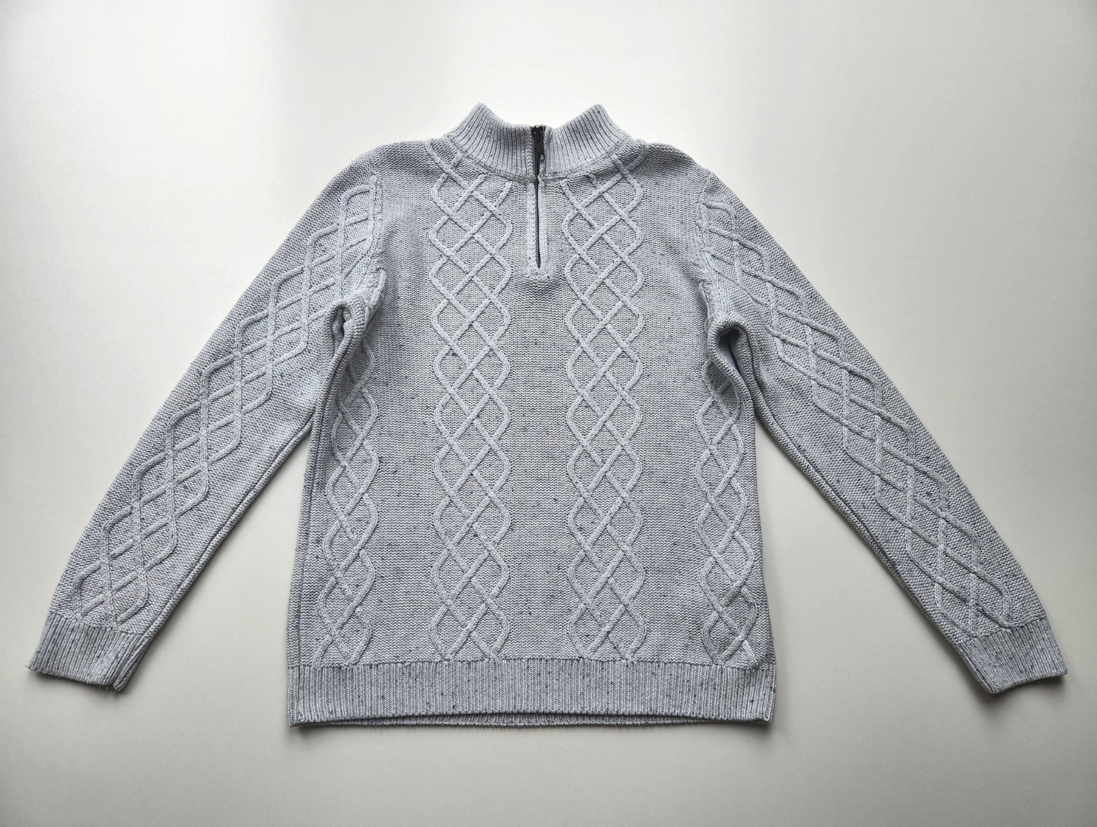 Světle šedý žíhaný svetr s vypleteným vzorem , žebrové lemy, výstřih na zip.