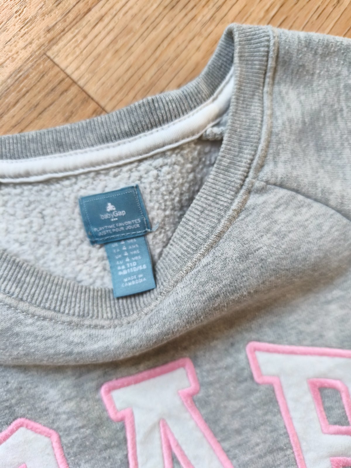 Šedá mikina Gap, sladce růžový lem kolem nápisu. Žmolík