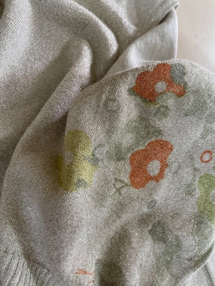 253. Nabízím k prodeji tento tenký svetřík s potiskem květů a vetkanou zlatou nití (ten odstín a třpyt nelze nafotit), HM. Velikost neuvedena, sedí při S/M, prosím měřte. Béžová základní barva s pozlacením v lehkém třpytu (na fotu nevyzní) Po straně potisk květů. V pase lehce stažen. Příjemný, pružný, tenký úplet ( 45%bavlna, 55%ramie) Nošený, bez vad, krásný).