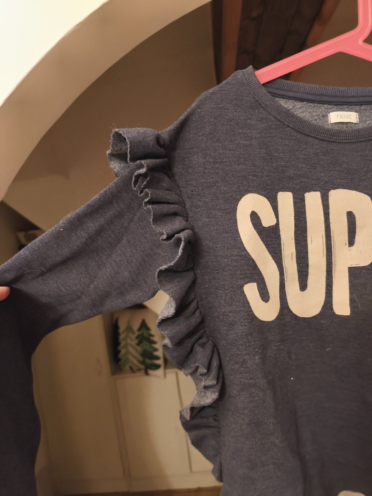 Mikina Next vel.146, volánky po stranách, nápis popraskaný. Uvnitř lehce zateplená.