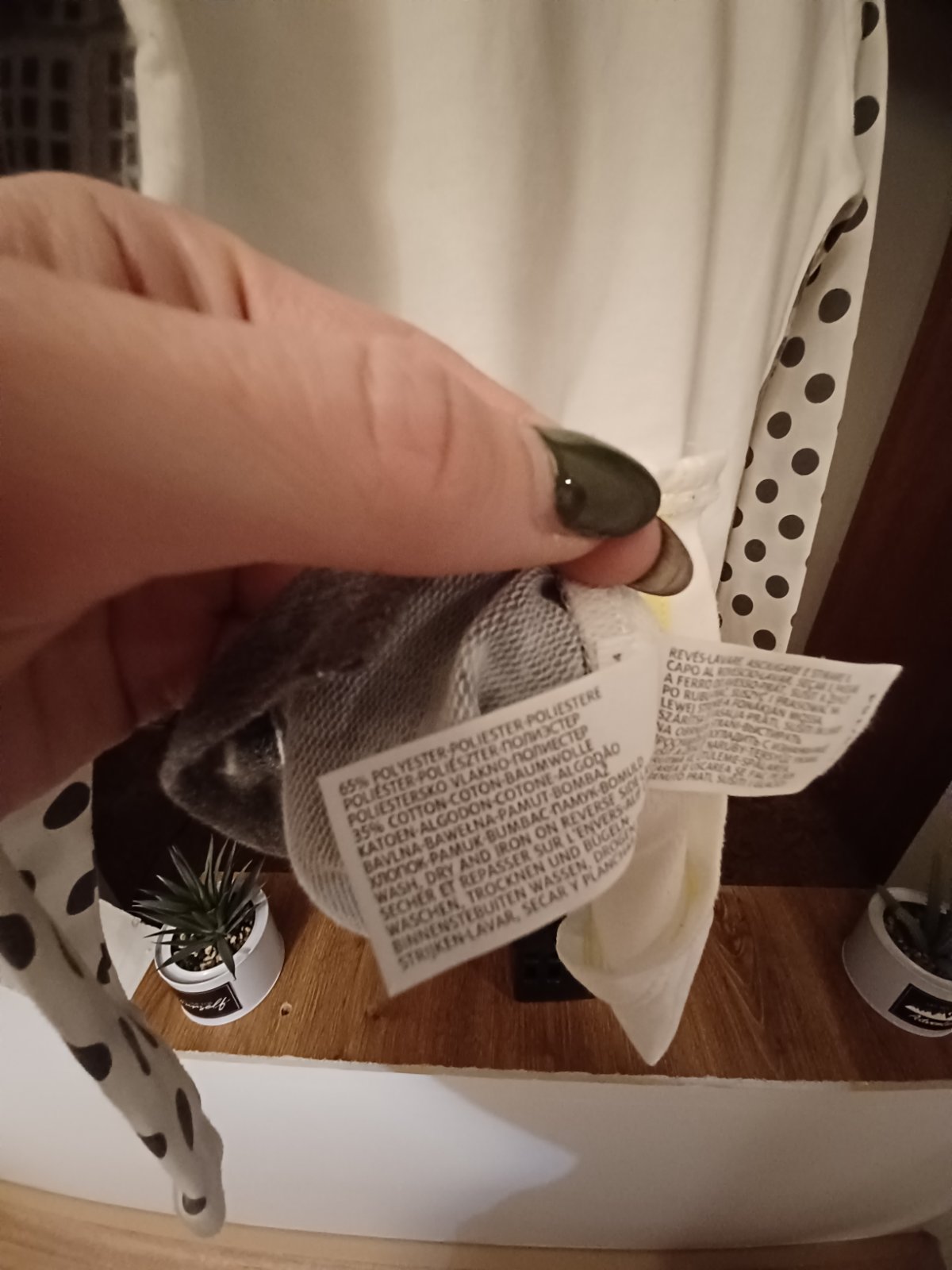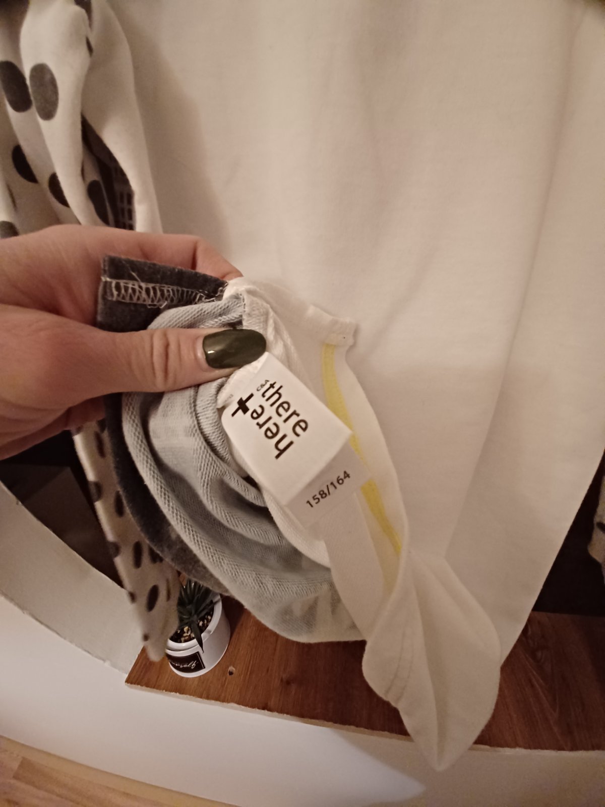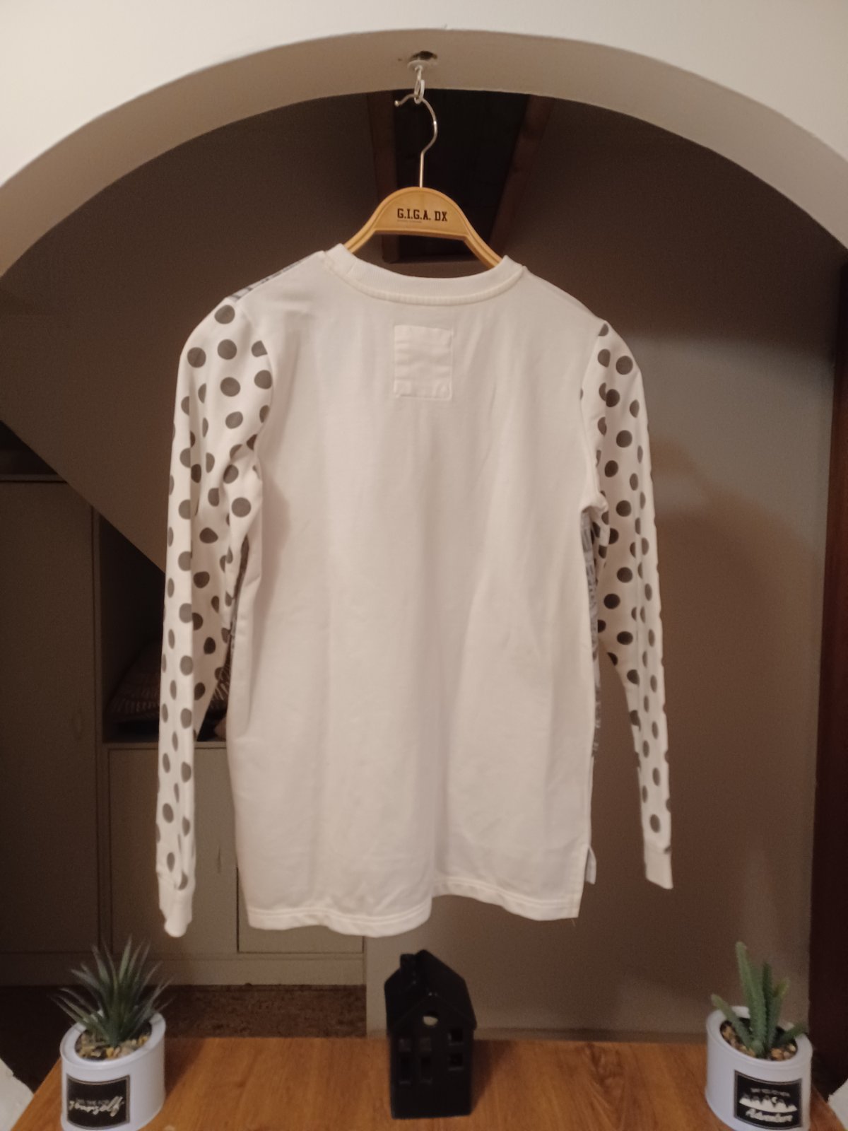 Pěkná mikina s puntíky, běžné známky praní, světlé barvy byly už při koupi. 158/164 nebo XS.