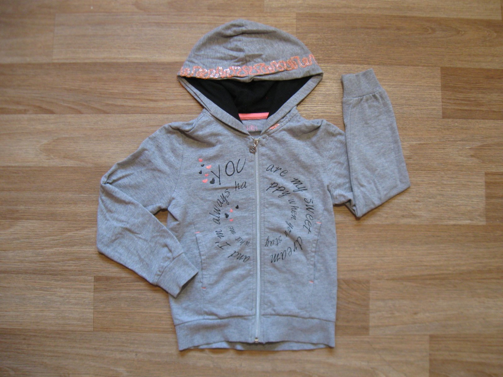 Prodam mikinu s kapuci velikost 110/116 H&M. Jsou na ni srdíčka, která se třpytí. Mikina je bez vad.