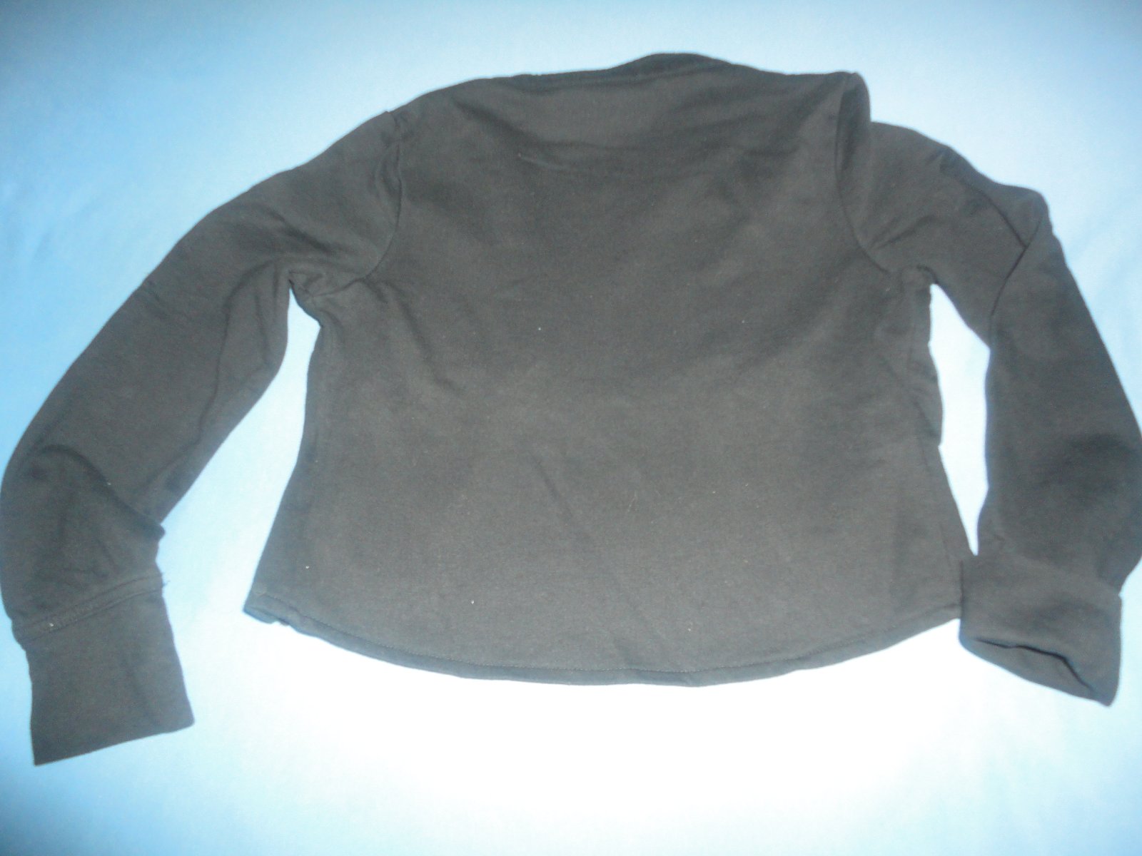 Sytě černé kratší sáčko bez zapínání, minimálně oblečené, materiál 80% bavlna, 20% polyester, d. 40cm, v průramku š. 38, rukáv od průramku 39cm, š. ramen 32,5cm, rukáv od ramene 50,5cm, od stojáku 59cm, lze ohrnout.