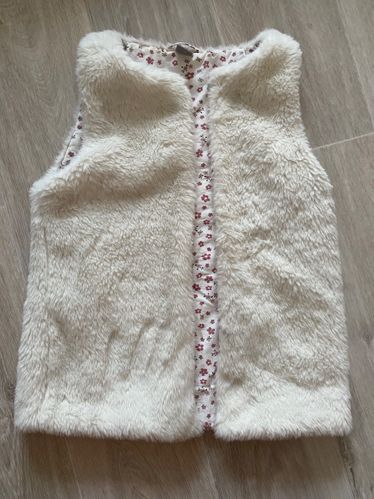 Nošená dívčí vestička přes hlavu, vel. 134. Délka 51 cm, šířka 34 cm. Barvička je béžová a se zlatou nitkou.