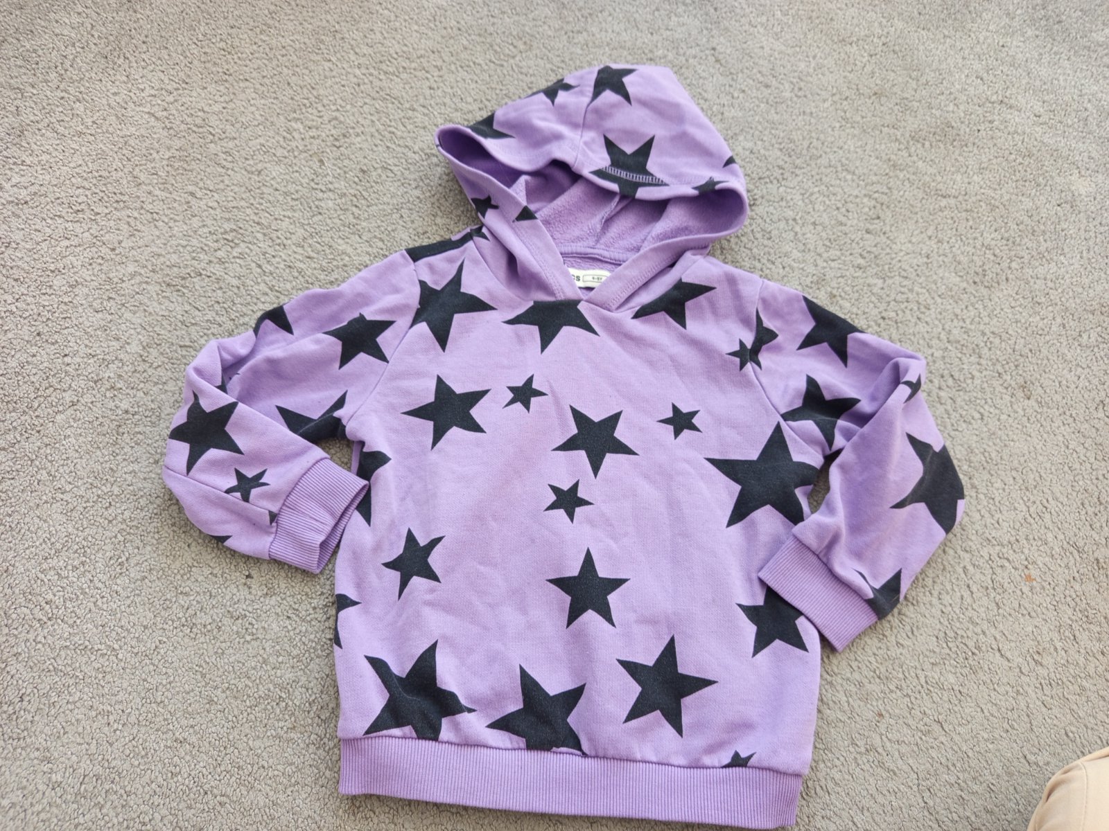 Světle fialová mikča(teplé triko přes hlavu. Materiál tenký flís. Vel uvedena 116, ale řekla bych 104-110. Nošená.