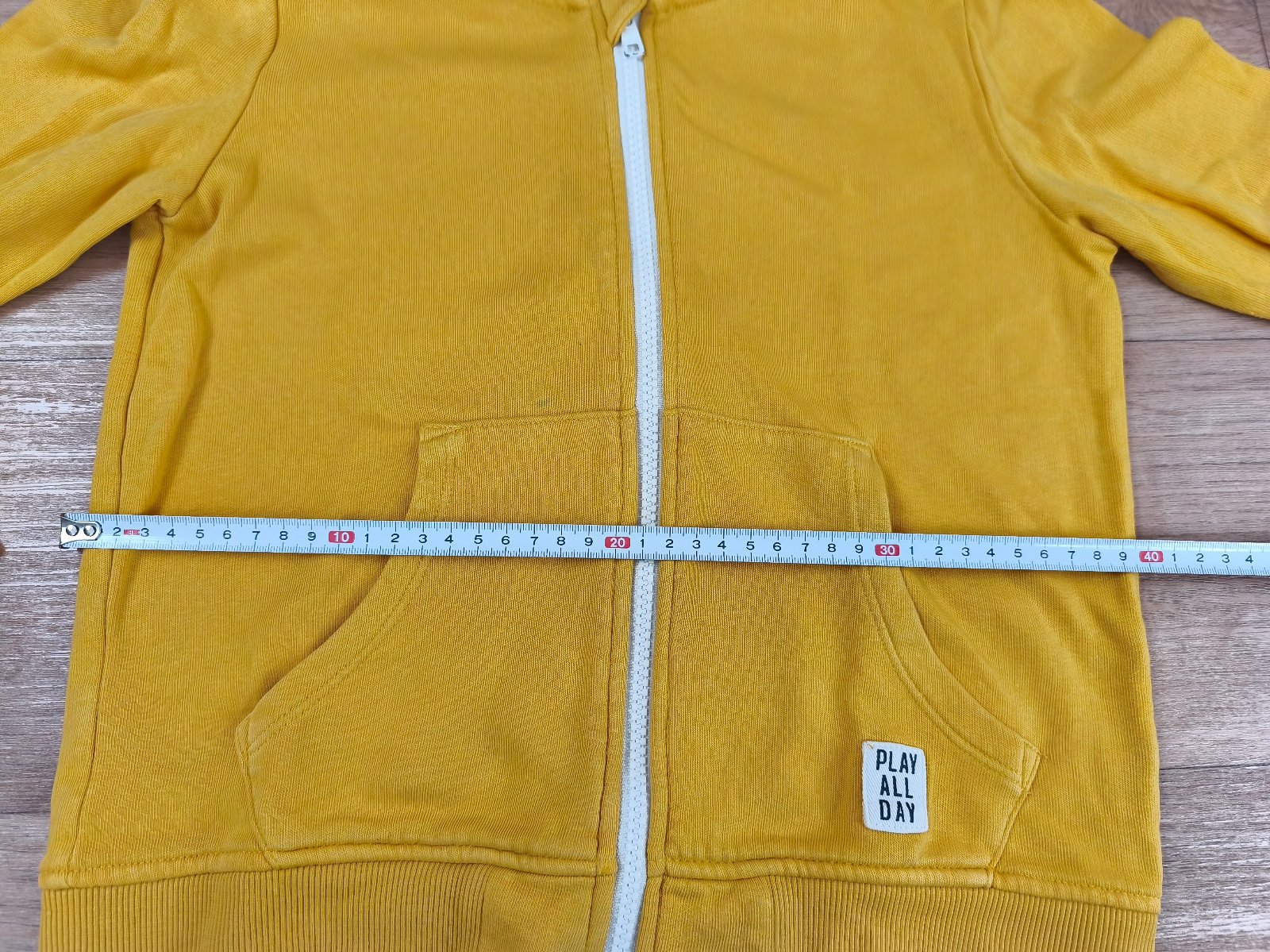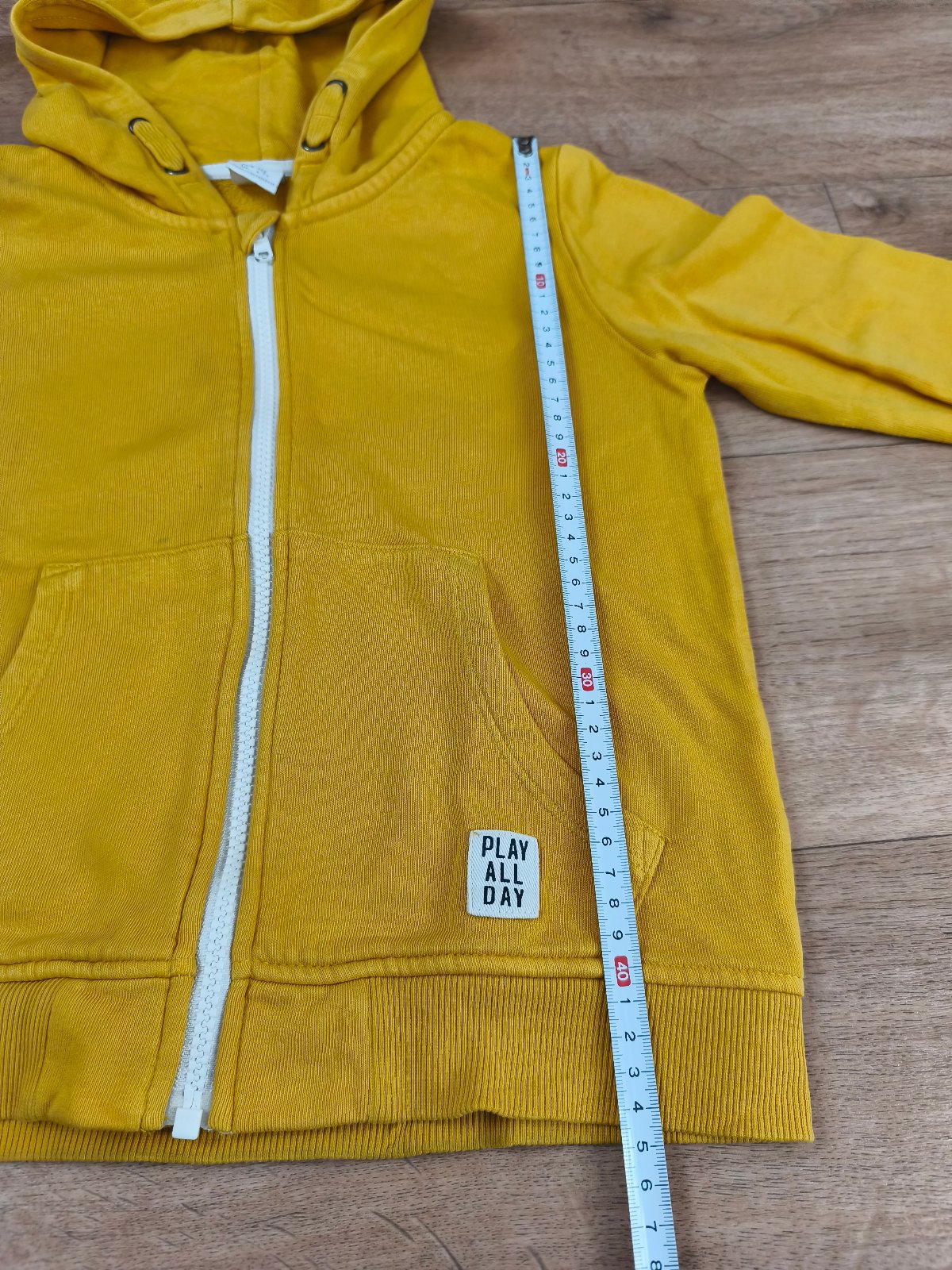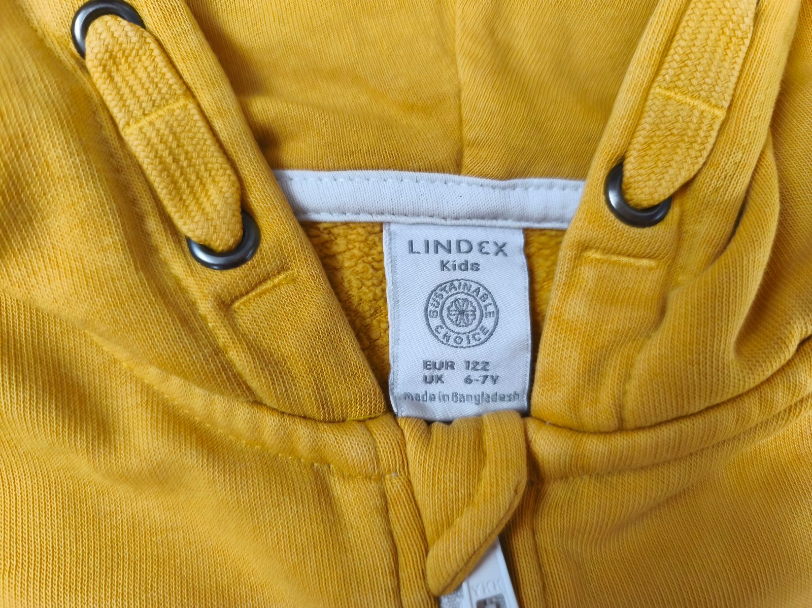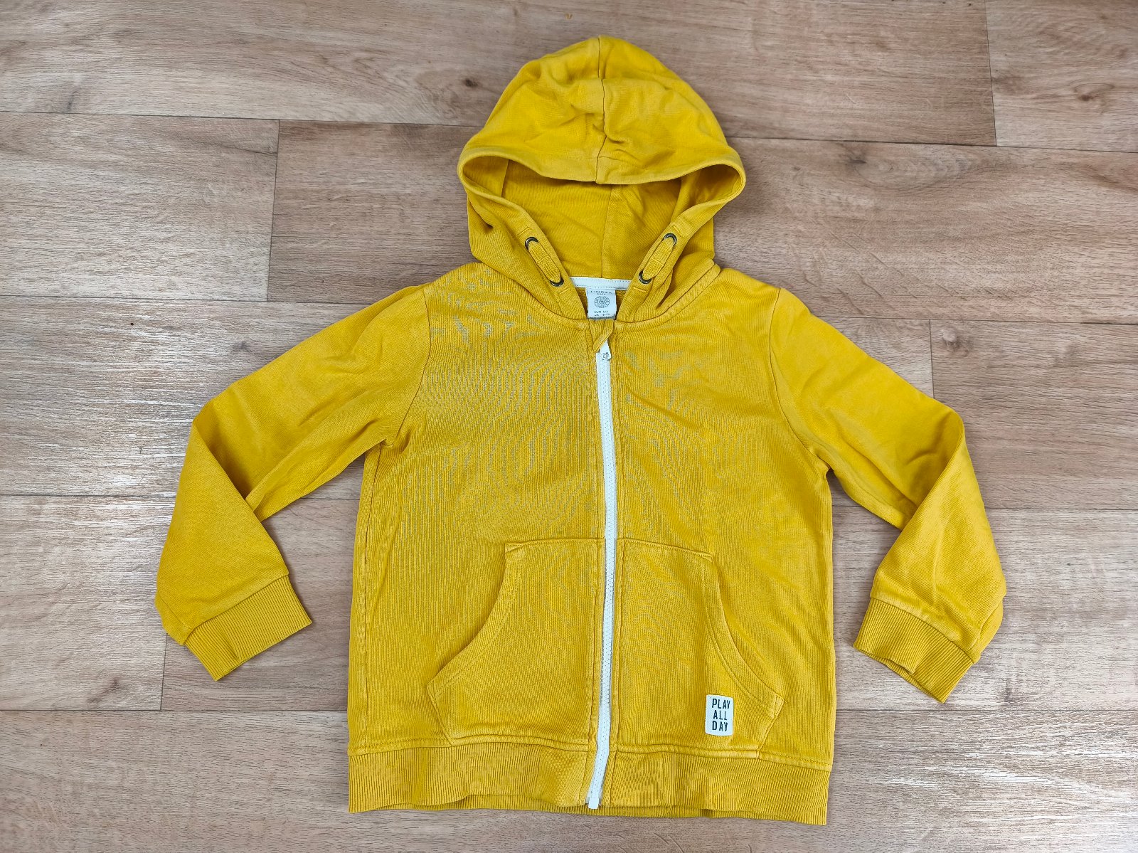 Hořčicově žlutá mikina na zip s kapucí zn. Lindex. Velikost 122 - rozměry a stav na fotkách. Nad kapsou 2 malinké modré flíčky (viz poslední foto).
