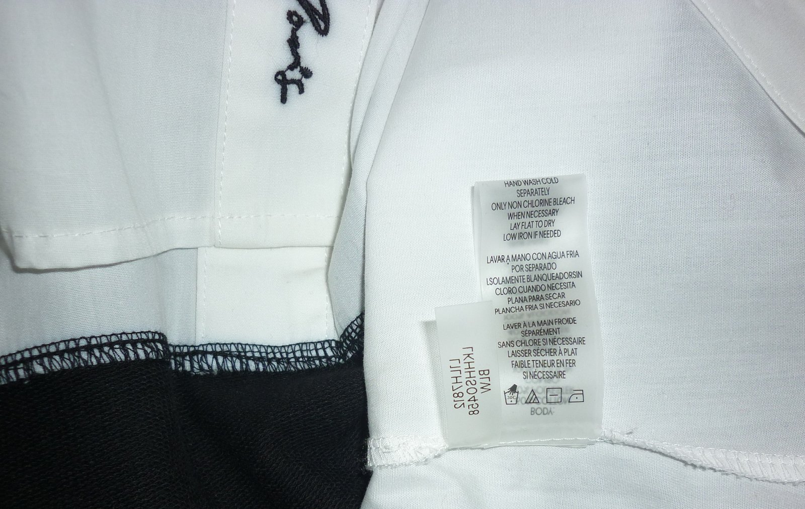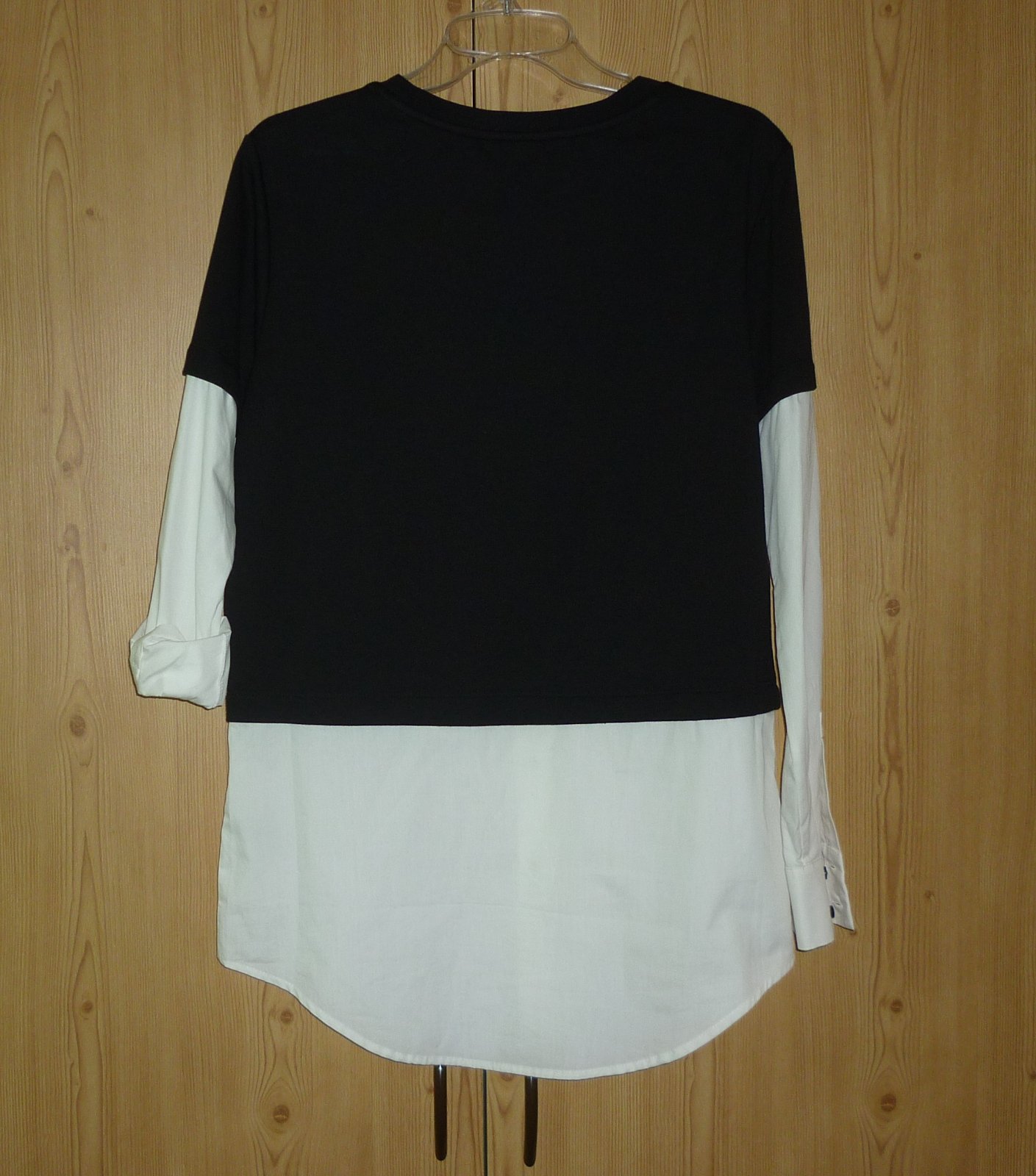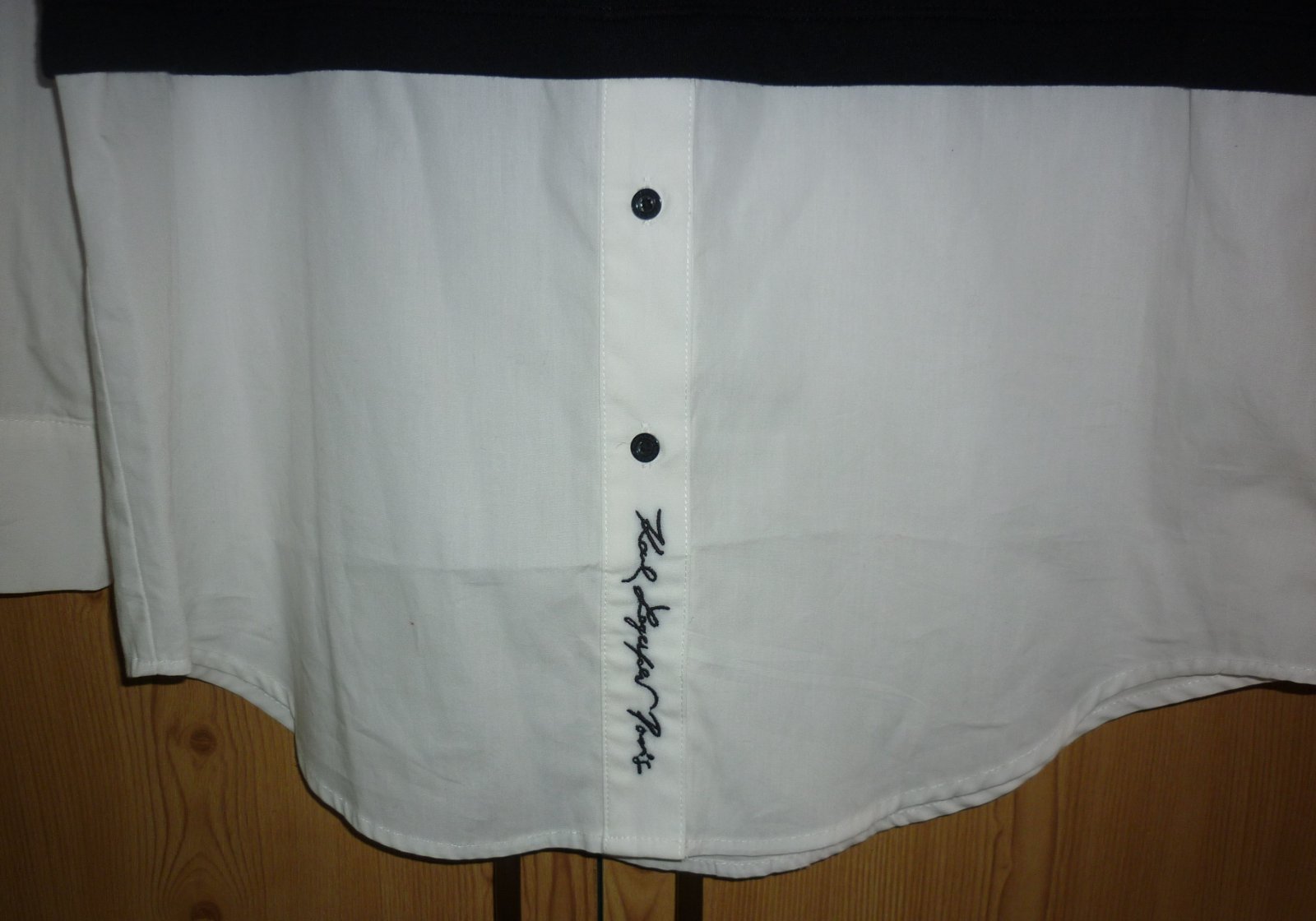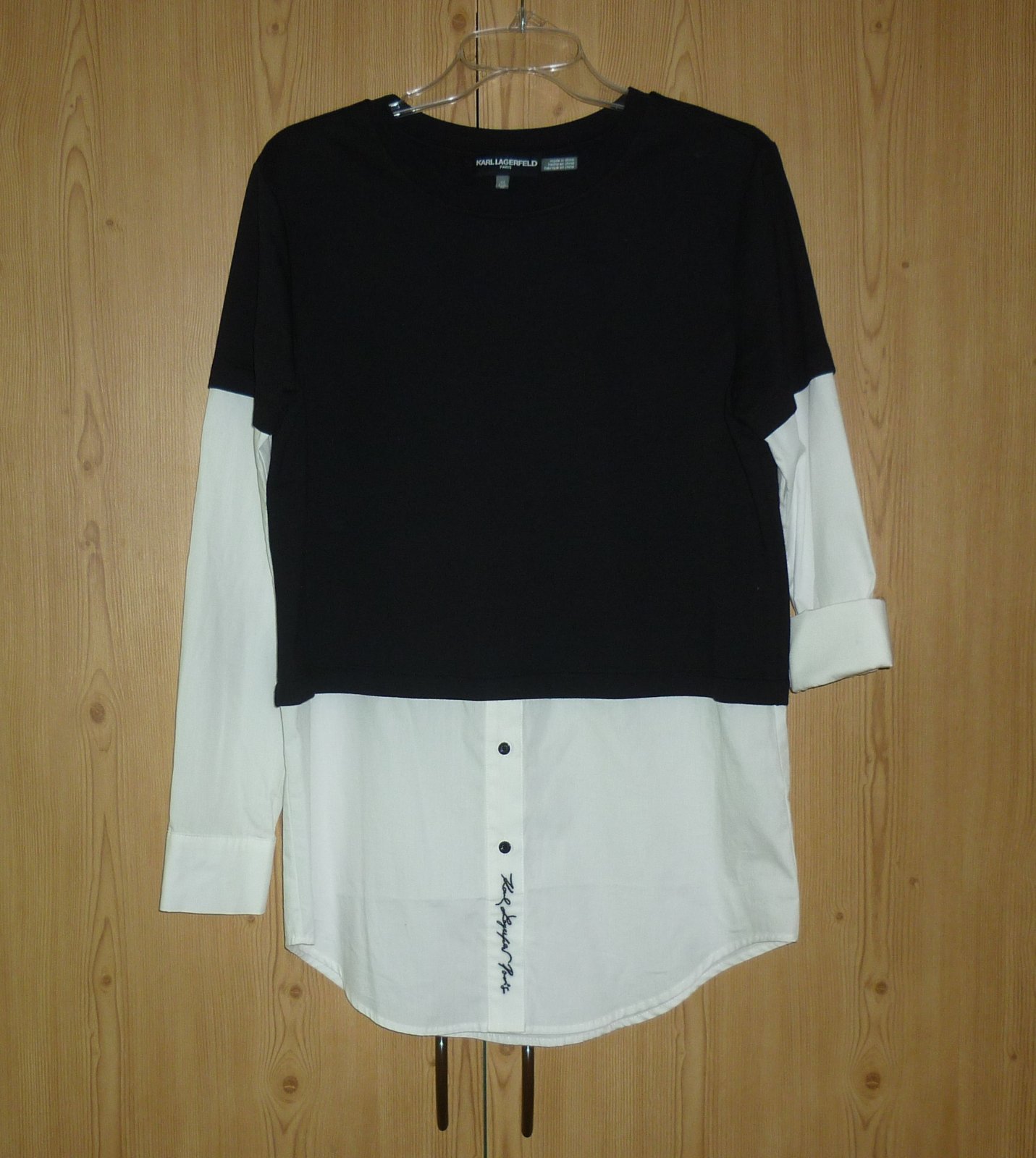 Prodám nádhernou černou dámskou mikinu s všitou bílou košilí Karl Lagerfeld, novou, nikdy nenošenou, pouze bez papírové visačky. Černá mikinová část je tenká, nezateplená. Košilové bílé rukávy jsou dlouhé se zapínáním na knoflíčky, košilový spodek je do obloučku, na přední části dole košilová léga s vyšitým černým logem je propínací na knoflíčky. Materiál: mikinová část - 60% bavlna a 40% polyester, košilová část - 100% bavlna. Velmi doporučuji! Velikost: XS. Rozměry: šířka v místě podpaží 51cm x 2, šířka dole 53cm x 2, délka rukávu od ramene 62cm, celková délka mikiny s košilí 77cm. Cena: 1499,-Kč + poštovné. Koukněte na moje další inzeráty, třeba si něco vyberete a ušetříte na poštovném. Tel.: 728 455 567