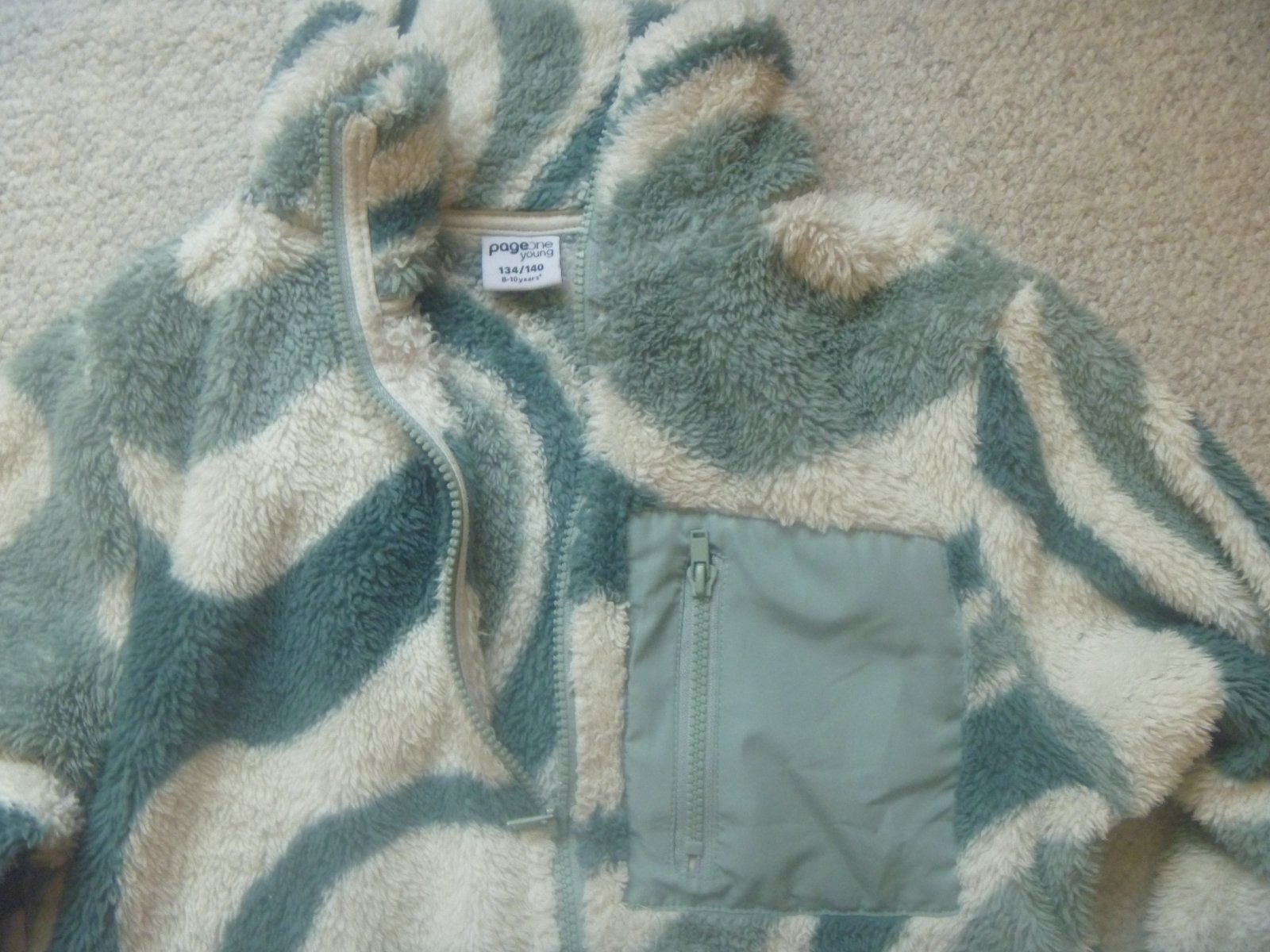 Prodám bílozelenou chlupatkovou mikinu se stojáčkem, bez kapuce, na zip, s jednou kapsou na zip a dalšími dvěma, značka Pageone young, velikost 134/140 (8-10 let), v dobrém stavu.