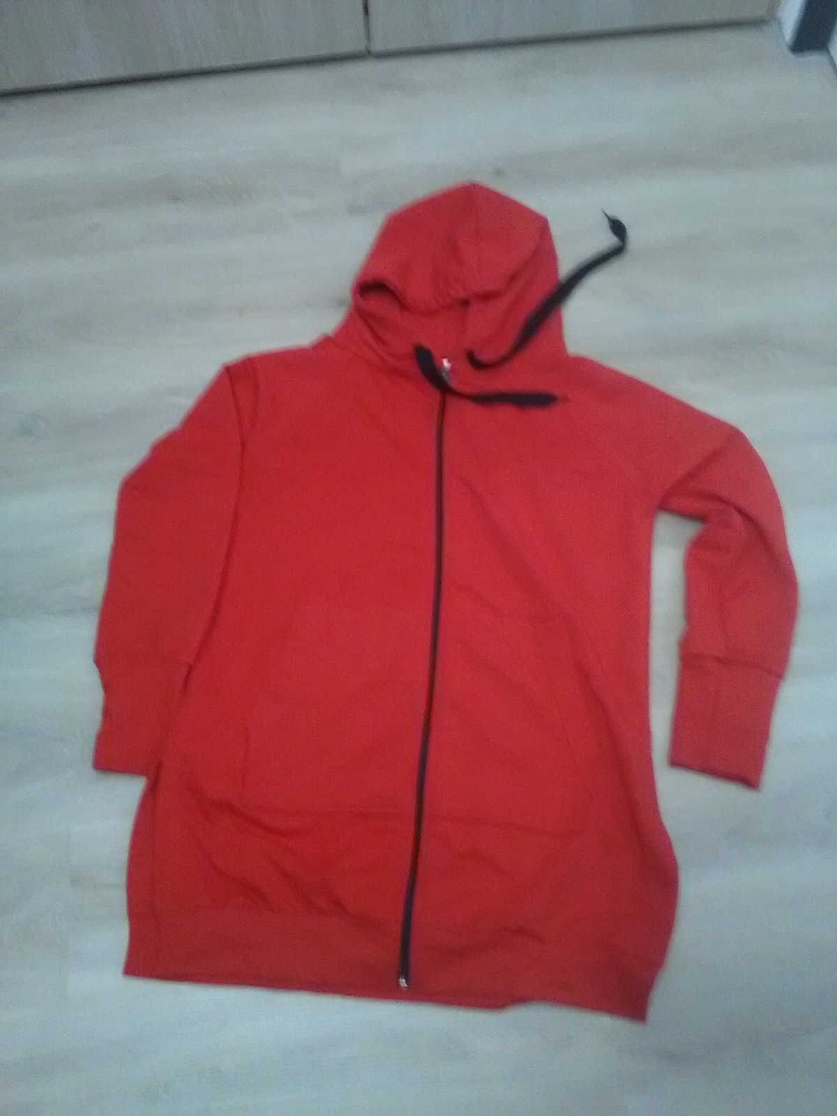 Mikina, velikost odhaduji L, nenošené, zapínání na zip,po stranách rozparky, velké kapsy. Délka 79cm, šířka v podpaží 54cm, rukáv od krku 68cm.
