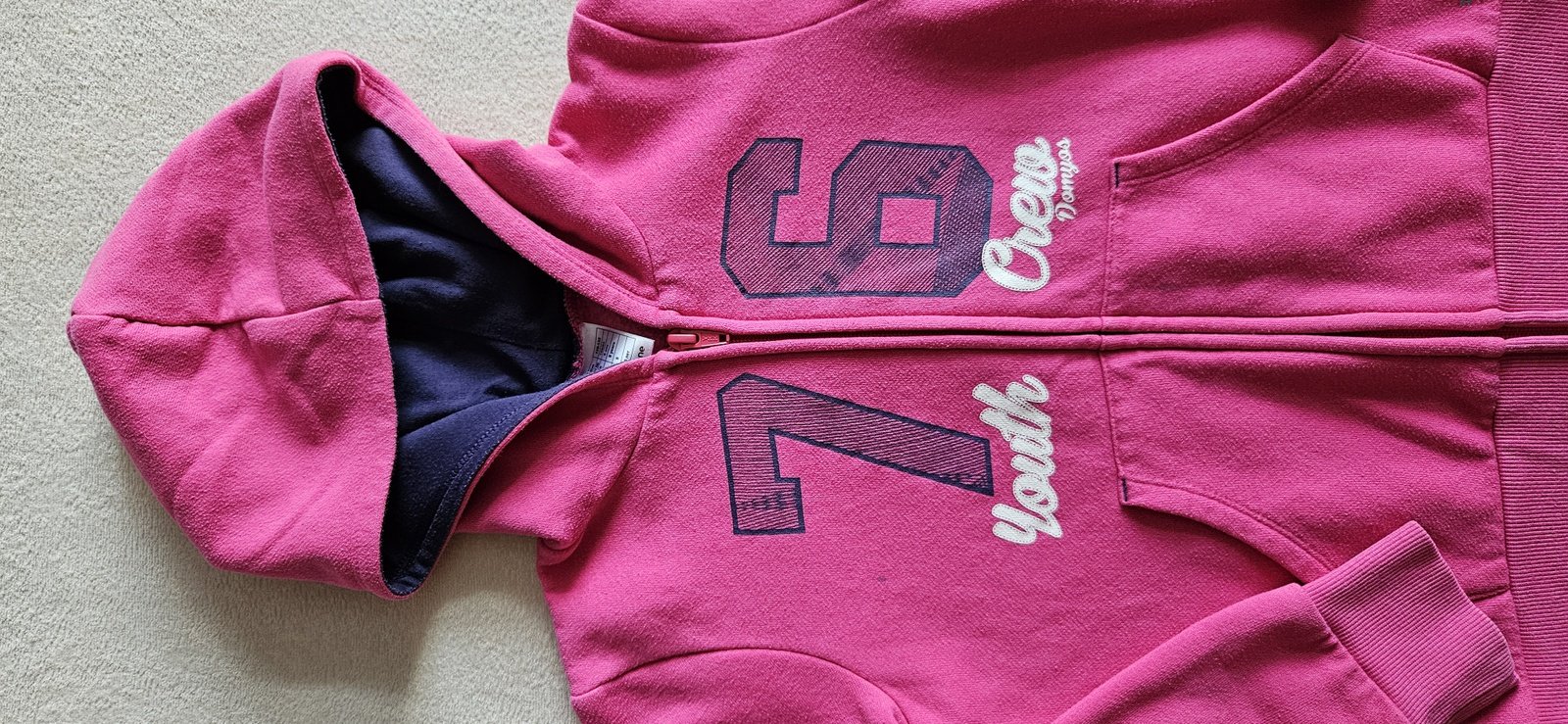 V pěkném stavu prodám sytě růžovou dívčí mikinu na zip s kapucí.
