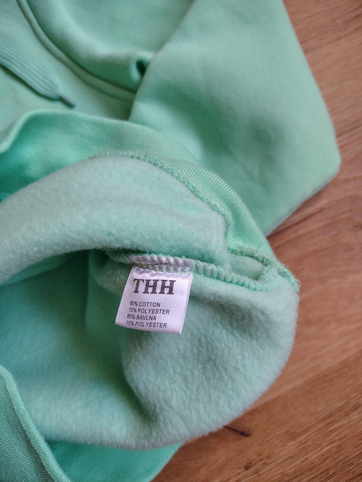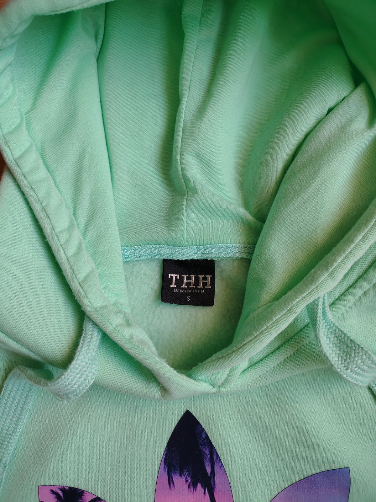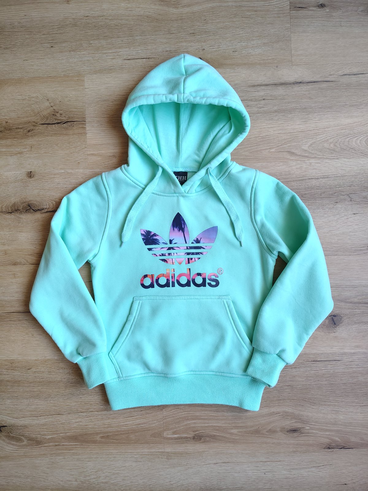 Dívčí silnější mikina s kapucí THH 158/164 přes hlavu typu "klokánka" mátově zelené barvy, uvnitř chloupek s nápisem Adidas (není originál). Uváděná velikost S, ale velikost odpovídá 158/164