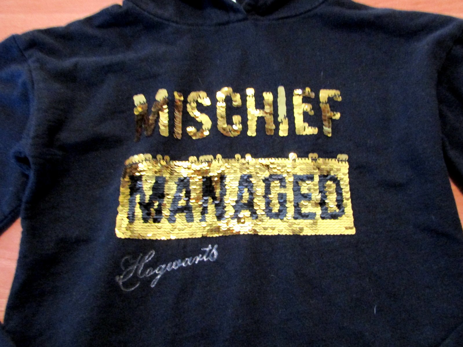 Čierna kratšia mikina pre mladé slečny, zn. Shein, velk. 152 (11-12rokov), dĺžka - 46cm, rukávy (od kapuce) - 56cm. Potlač na prednej strane a rukávoch. V super stave.