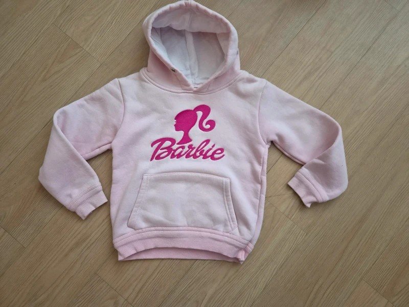 Mikina s motivem Barbie, velikost 98/104, kupovaná v cizině, teplejší, uvnitř chloupek, nošená – místy lehce vyšisovaná barva, oprala se, jinak stále hezká a určitě ještě poslouží.