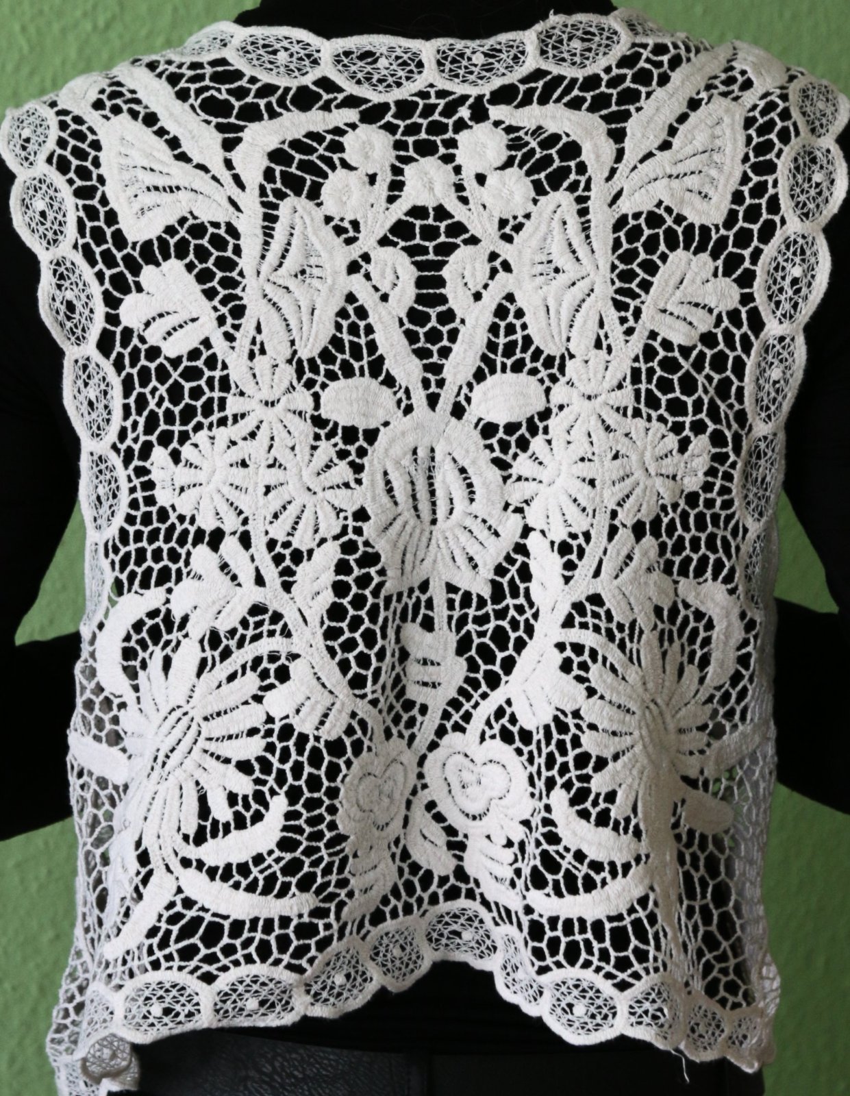 Nádherný kousek. Dámská vesta z niťové gipýrské krajky, bohatě květovaný vzor přesně vyplňující jednotlivé dílky vesty. Jedná se o větší číslo, odhaduji 48-50, možná i víc. Foceno na postavě 36. Barva přírodní bílá - smetanová. Na míry se ptejte, ráda zašlu. Stav vestičky super, žádné vady.
