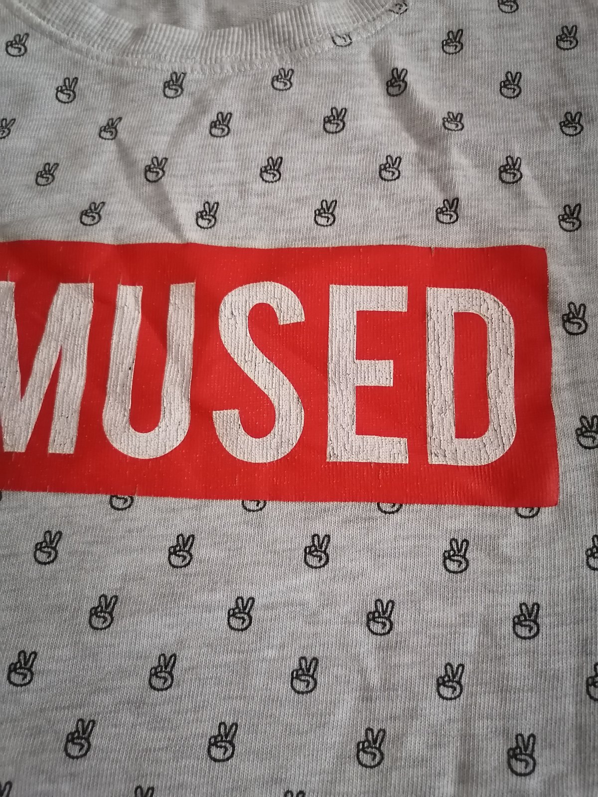 Tenší bavlněná mikina. Nápis popraskaný. Rukáv od ramene 55 cm, délka 56,5 cm, šířka 45,5 cm.