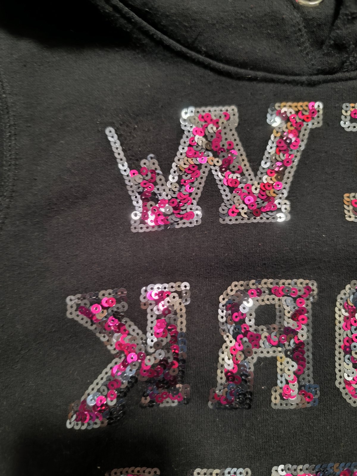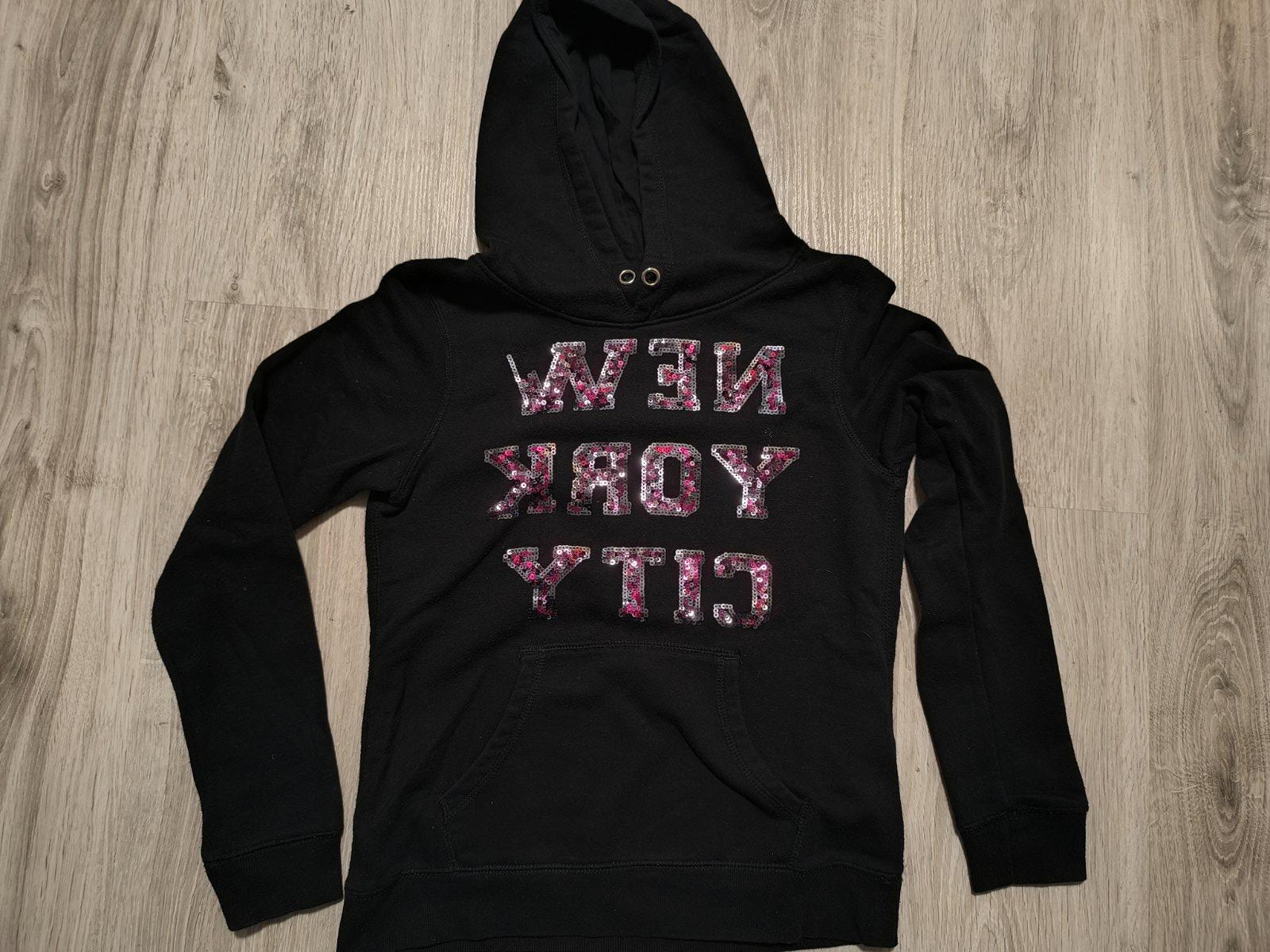 V kapuci nejsou šňůrky a je trochu odpárane jedno písmenko viz.foto. Nošená ,praná .. vel.158/164