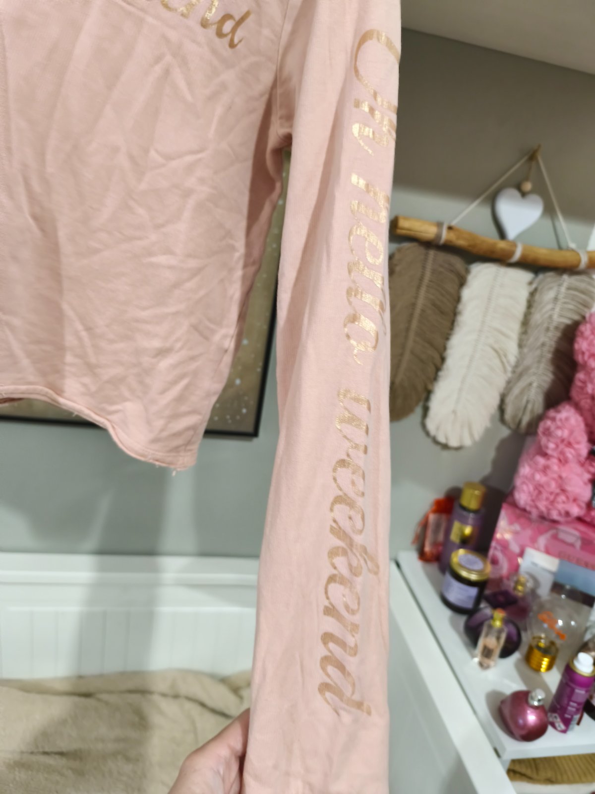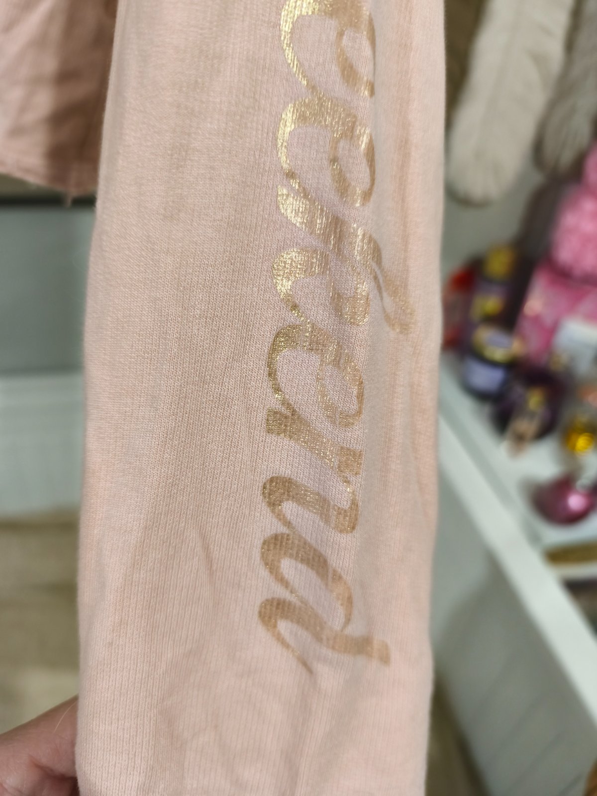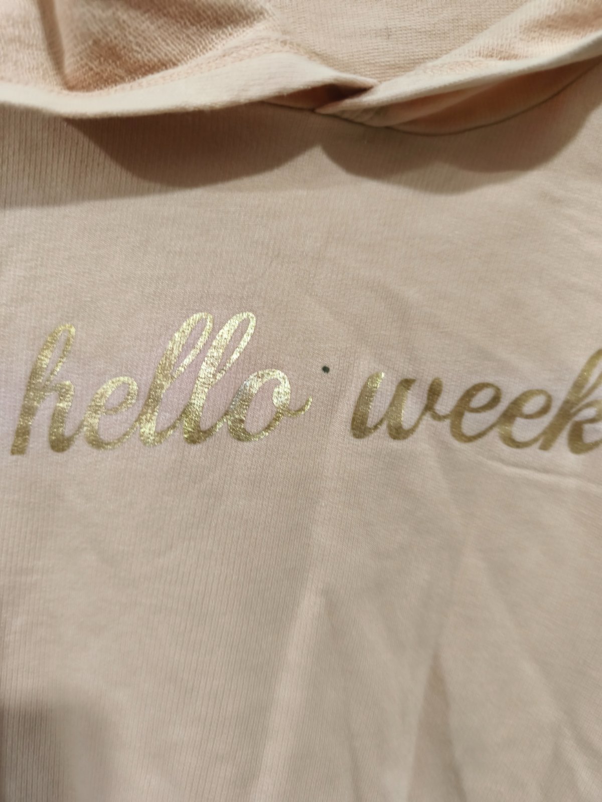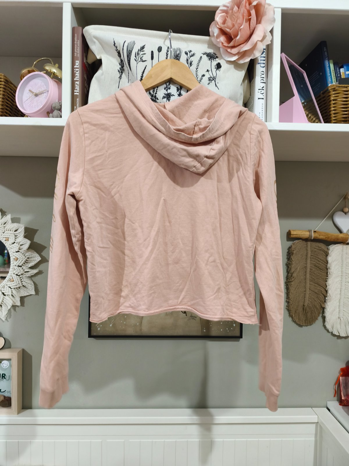 Starorůžová krátká mikina s nápisem, bohužel černá tečka mezi naposem, nepodařilo se mi odstranit. Zohledňuji v ceně. Vel. 170, sedí i XS/S.