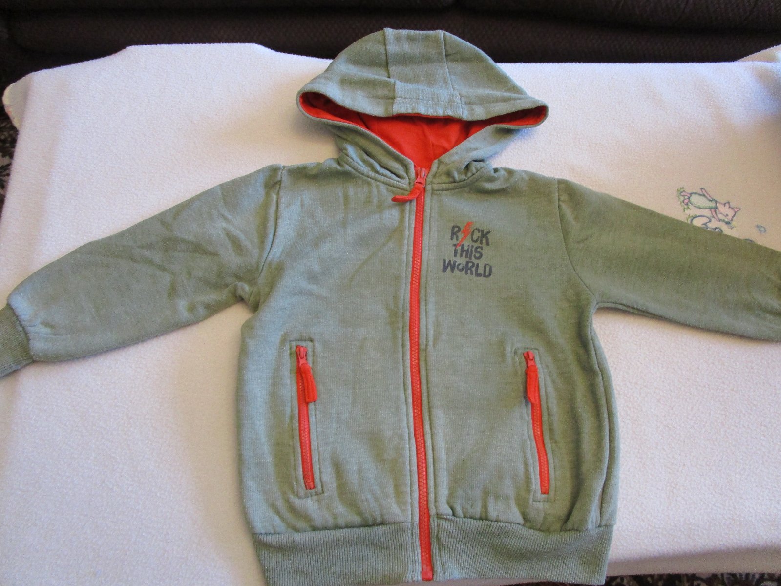 Oteplená zelená mikina s kapucí, zapínání na zip, kapsy, vel. 104 (3-4 roky), cena jen 39 Kč.