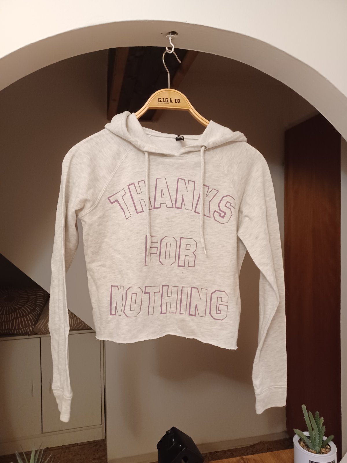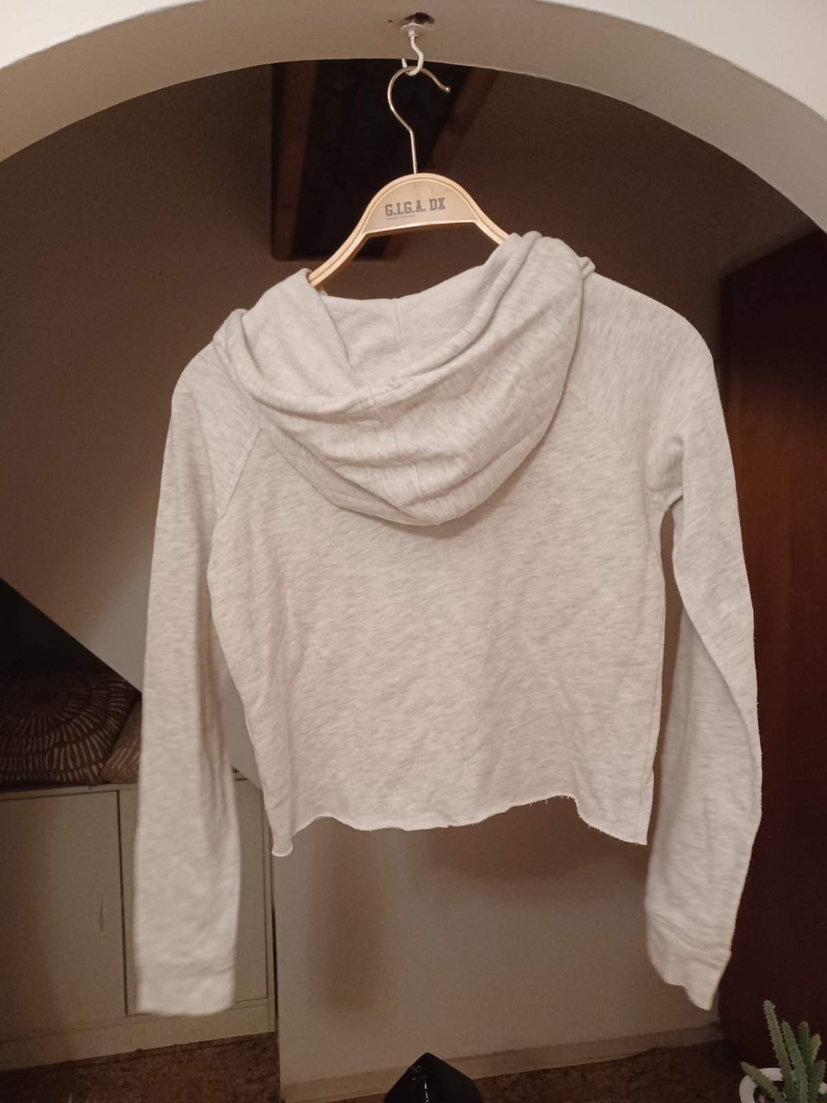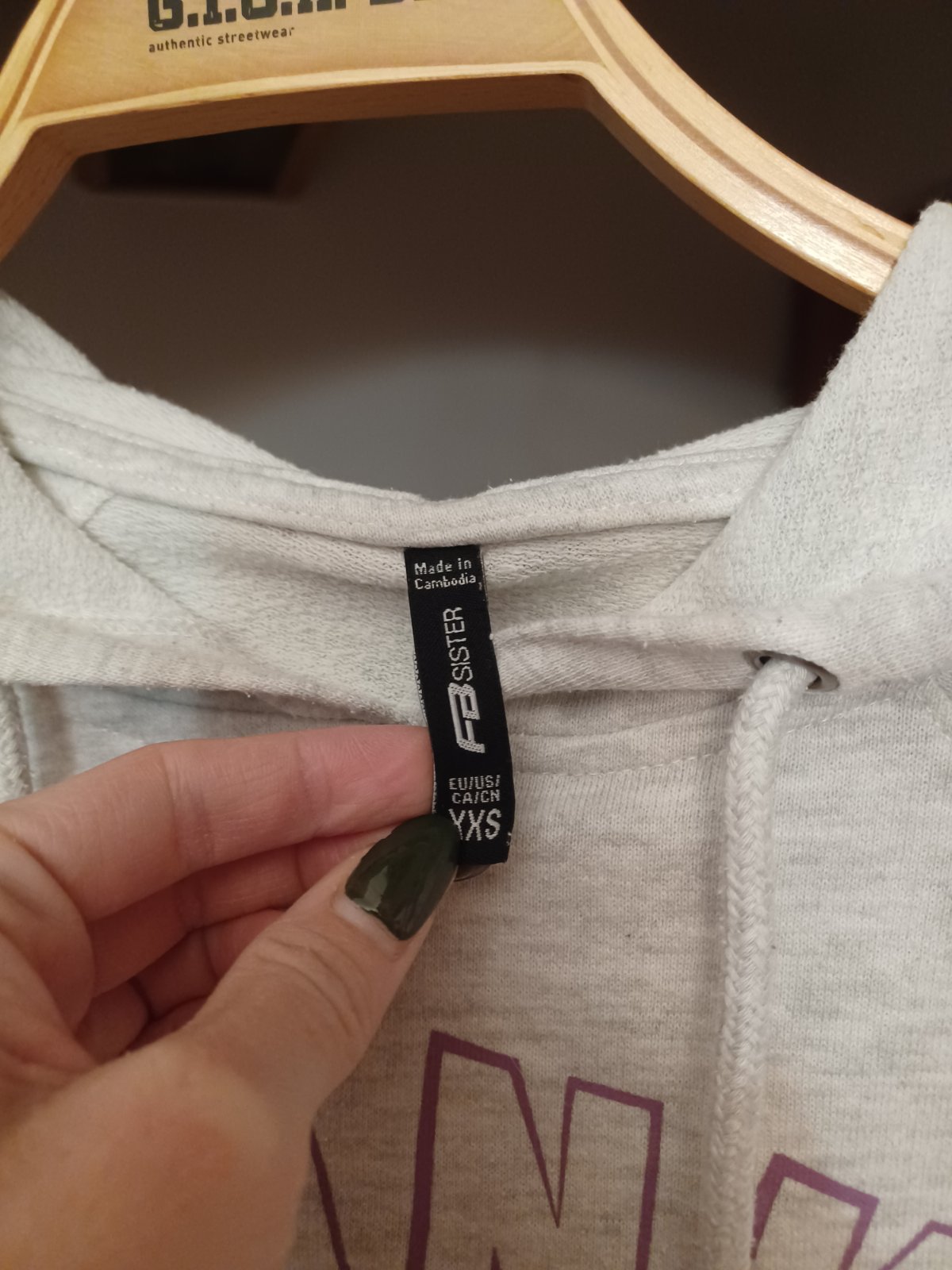 Krátká mikina s kapucí Fb sister XXS, nošená při 158. Žmolík
