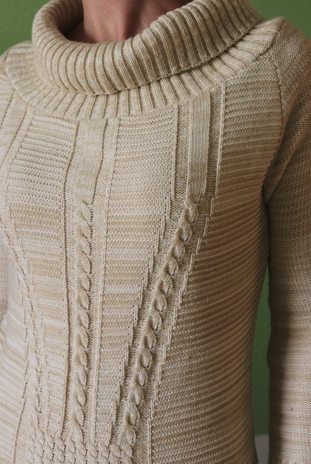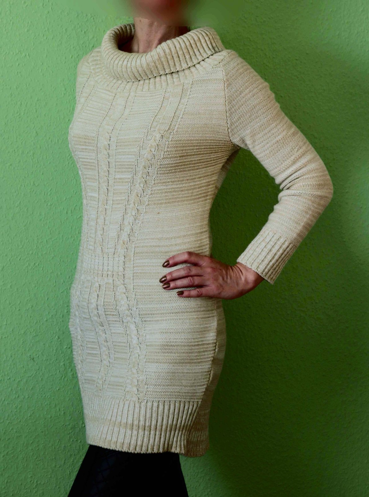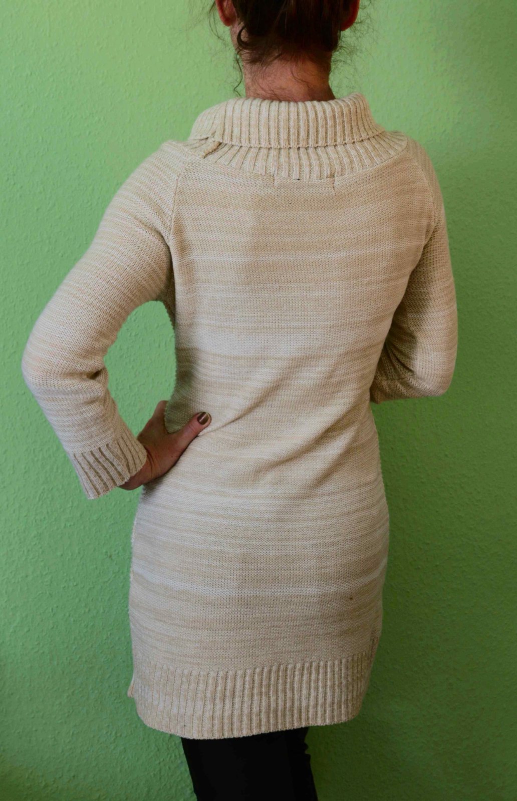 Silnější dlouhý svetr z melírované příze - přírodní a krémová, se vzorem osmiček na předním díle, límec je volnější chomoutový rolák. Svetr nemá žádné známky nošení, stav super. Velikost není uvedena, řekla bych že odpovídá asi velikosti M-L. Přesné rozměry Vám ráda zašlu. Odeslání poštou, Balíkovnou nebo Zásilkovnou, cenu za odeslání dám vědět předem.
