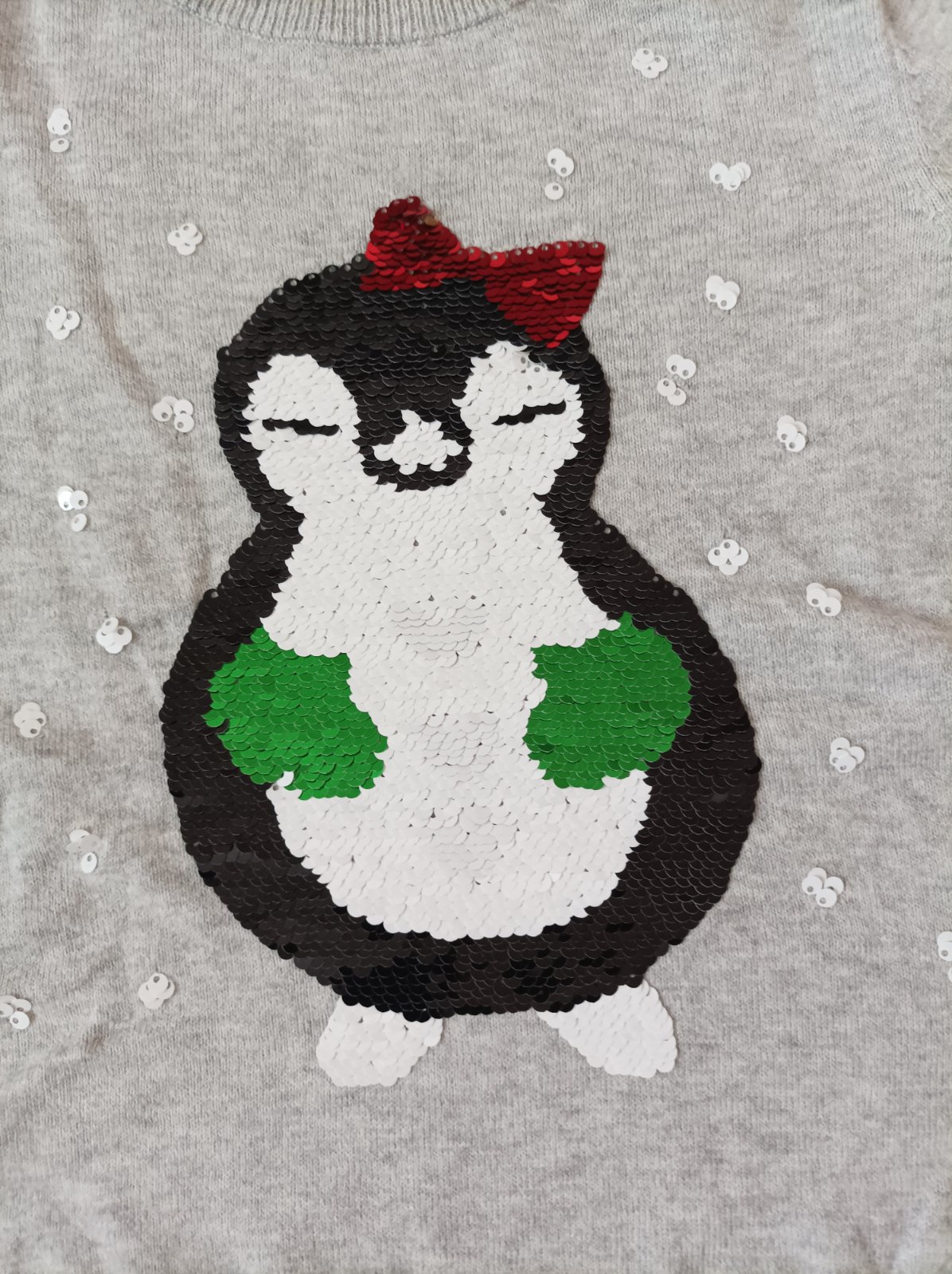 Šedý svetřík s aplikací tučňáka, flitry jsou měnící. Je minimálně nošený v pěkném stavu bez flíčků, dírek a žmolků, uvedená velikost 122/128.