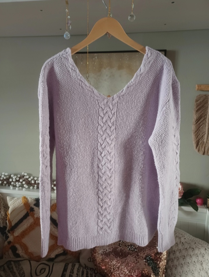 Lila svetr s hlubokým výstřihem na zádech s copánkovým vzorem. Běžné známky praní, žmolík.